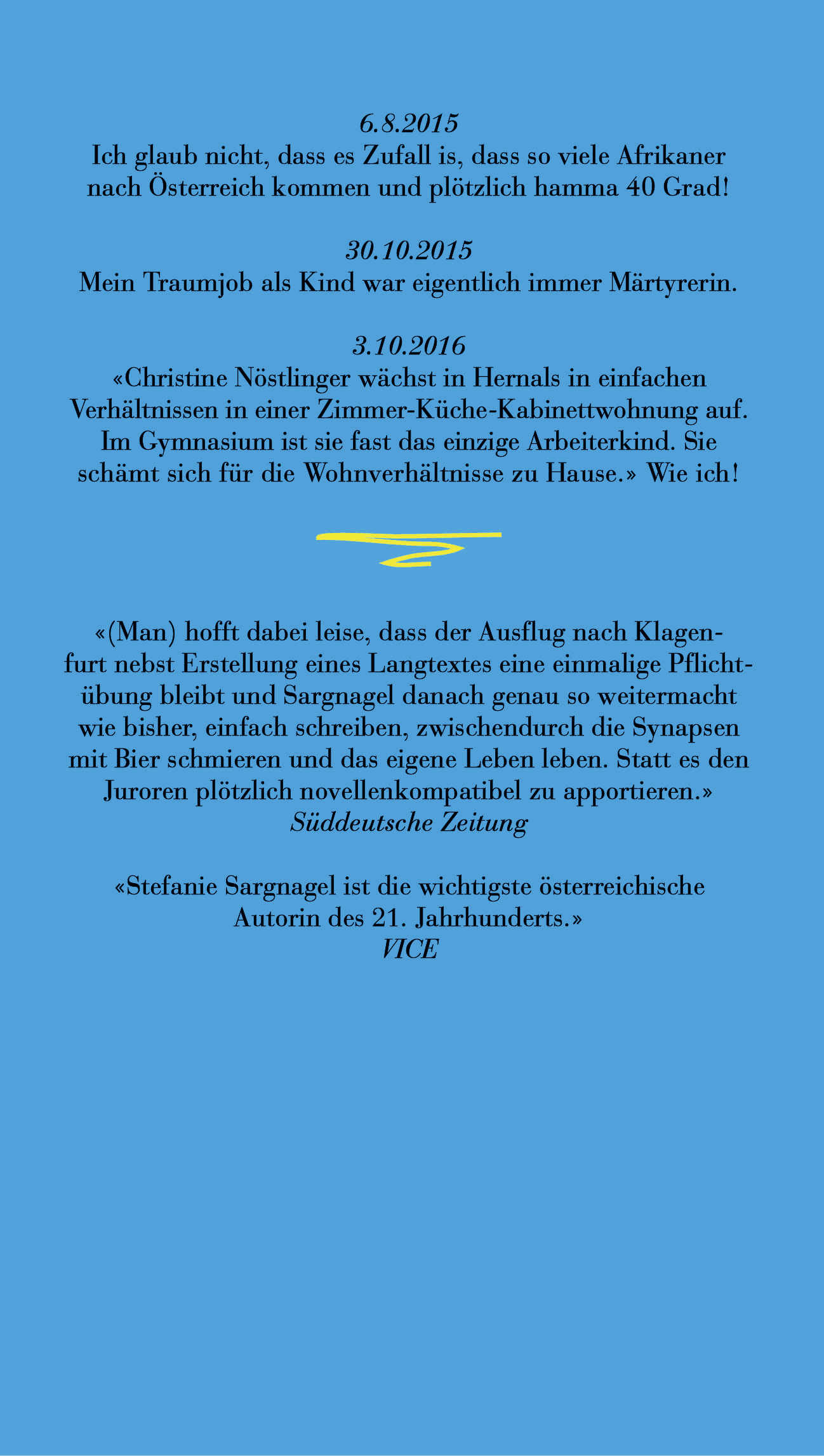Sargnagel kommt aus dem Internet und ist, mit Ausnahme von Rainald Goetz und seinem Online-Tagebuch «Abfall für alle», die erste deutschsprachige Autorin, die im Netz eine Form für sich gefunden hat, die passt, als Literatur funktioniert und über die bisherigen Kanäle ein großes Publikum erreicht. Stefanie Sargnagel schreibt radikal subjektiv und sehr weise über das sogenannte einfache Leben, über Feminismus, über Aussichtslosigkeit und Depression. Stefanie Sargnagel gibt sich wortkarg, gerät aber doch immer wieder ins Erzählen, zeichnet zwischendurch auch mal was, sprengt alle Genregrenzen und erreicht auf nie betretenen Pfaden etwas, das man nicht Roman nennen muss, um davon gefesselt zu sein. Das ist oft zum Brüllen komisch und manchmal tragisch. Ihre Texte sind wie ein Gipfeltreffen zwischen Christine Nöstlinger und Heinz Strunk, aus denen beide mit einem Mordskater hervorgehen.