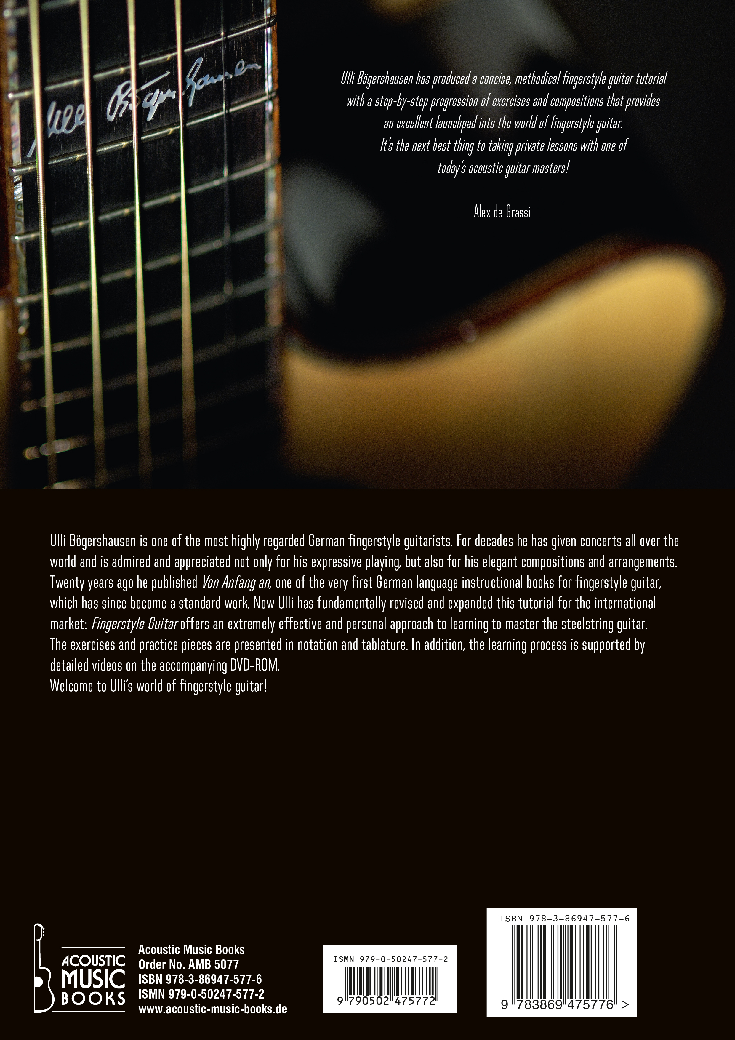 Ulli Bögershausen is one of the most highly regarded German fingerstyle guitarists. For decades he has given concerts all over the world and is admired and appreciated not only for his expressive playing, but also for his elegant compositions and arrangements. Twenty years ago he published "Von Anfang an", one of the very first German language instructional books for fingerstyle guitar, which has since become a standard work. Now Uli has fundamentally revised and expanded this tutorial for the international market: Fingerstyle Guitar offers an extremely effective and personal approach to learning to master the steelstring guitar. The exercises and practice pieces are presented in notation and tablature. In addition, the learning process is supported by detailed videos on the accompanying DVD-ROM. Welcome to Uli's world of fingerstyle guitar!