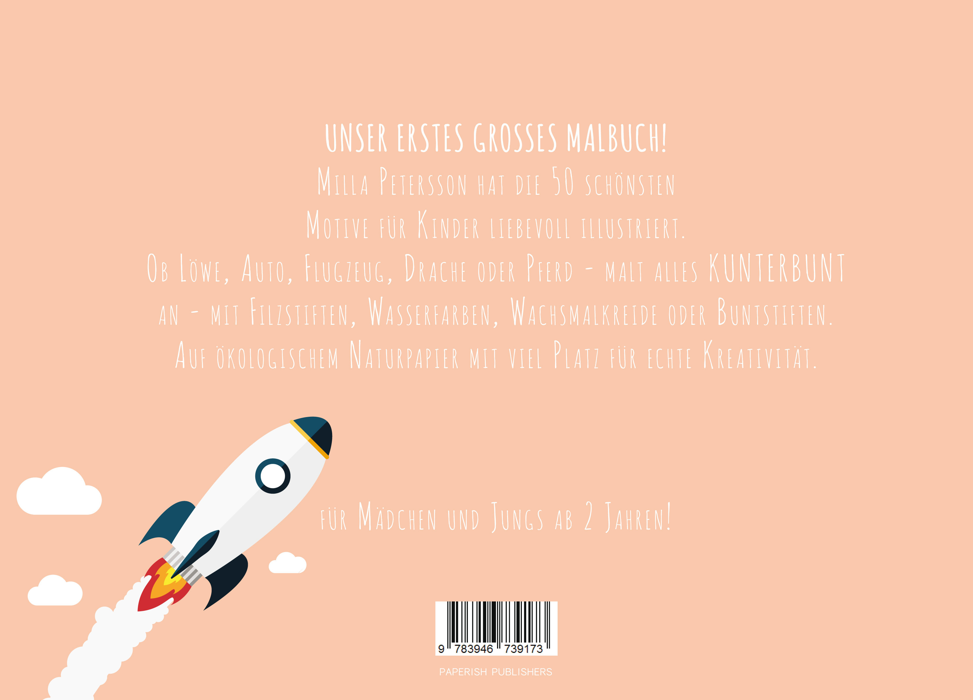 UNSER ERSTES GROSSES MALBUCH!Milla Petersson hat die 50 schönsten Motive für Kinder liebevoll und innovativ illustriert.Ob Löwe, Auto, Flugzeug, Drache oder Pferd - malt alles KUNTERBUNT an - mit Filzstiften, Wasserfarben, Wachsmalkreide oder Buntstiften. Hergestellt auf dickem Naturpapier mit viel Platz zum kreativen malen.Für Mädchen und Jungs ab 2 Jahren.