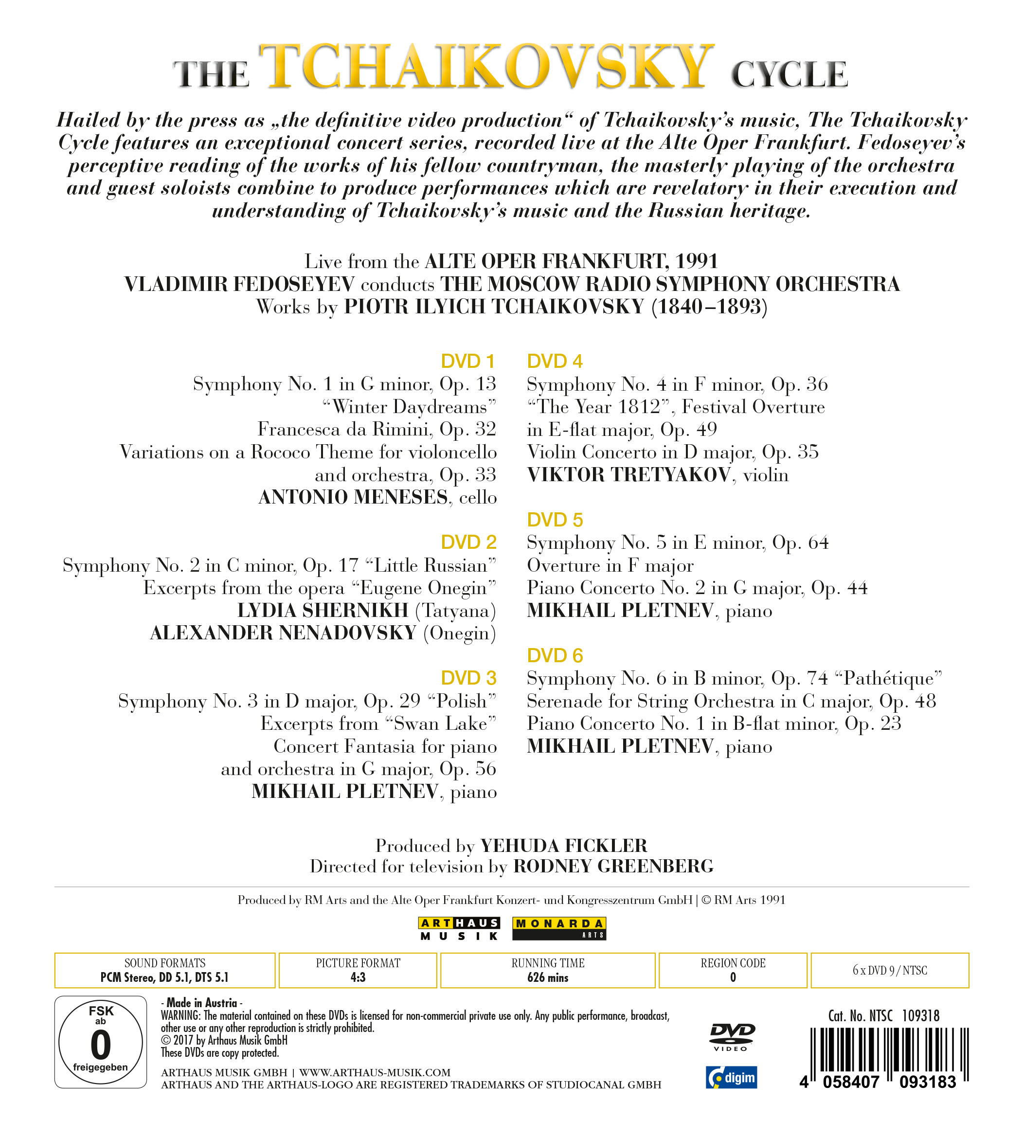 DVD 1: 1. Sinfonie g-Moll op. 13 "Winterträume", Francesca da Rimini e-Moll op. 32, Rokoko-Variationen A-Dur op. 33; DVD 2: 2. Sinfonie c-Moll op. 17 "Kleinrussische", Exzerpte aus der Oper "Eugen Onegin"; DVD 3: 3. Sinfonie D-Dur op. 29 Polnische, Exzerpte aus "Schwanensee", Konzertfantasie G-Dur op. 56; DVD 4: 4. Sinfonie f-Moll op. 36 "Fatum", Festovertüre "1812" op. 49, Violinkonzert D-Dur op. 35; DVD 5: 5. Sinfonie e-Moll op. 64, Ouvertüre F-Dur, Klavierkonzert Nr. 2 G-Dur op. 44; DVD 6: 6. Sinfonie h-Moll op. 74 "Pathétique", Serenade für Streicher in C-Dur op. 48, Klavierkonzert Nr. 1 b-Moll op. 23