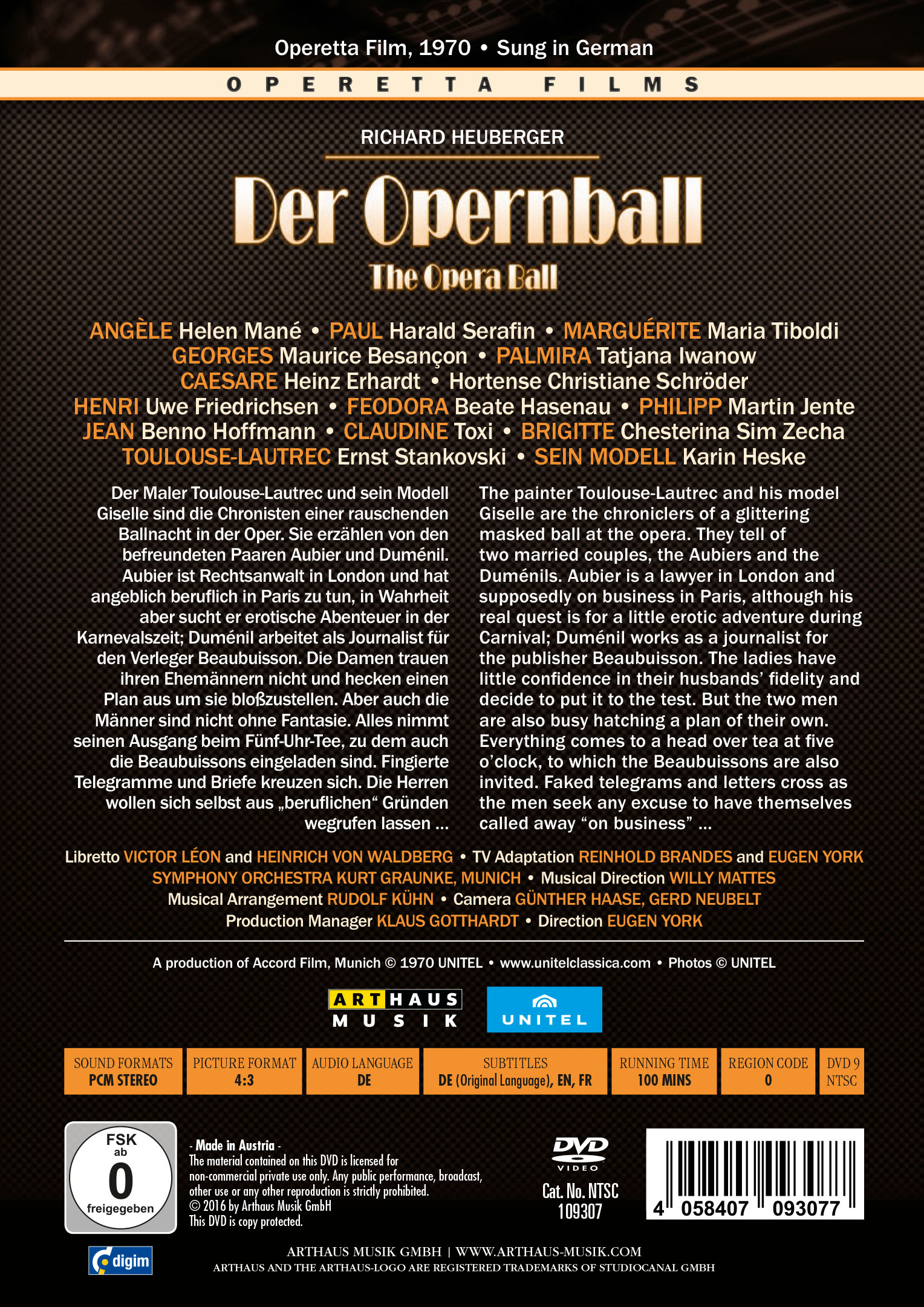 Richard Heuberger (1850–1914) came from a wealthy, art-loving Graz (Austria-Hungary) family. After working as an engineer, he decided to devote himself completely to music, working as choral director of the Vienna Singakademie, composer of instrumental music, ballets, cantatas and operas, music critic and music journalist. Shortly before the turn of the century, he tried his luck with operettas. Only his first work, the delicately orchestrated, splendidly hued “Opernball” (Opera Ball ) of 1898 – a beautiful and substantial echo of the Strauss era – has managed to maintain its position in the repertoire. In this work, Heuberger tried to create a new operetta style, the “comedy operetta”. He eschewed spectacular costumes and choruses, sentimentality and drama by picking up where Offenbach had left off in “La vie parisienne” and Strauss in “Die Fledermaus”. According to the great Viennese music critic Eduard Hanslick, he succeeded in “preserving the purity of the Viennese operetta. The “Opernball” was a popular, witty piece and Heuberger accordingly avoided the effects of grand opera, both noisy passion and atered-down sentimentality.” Richard Heuberger (1850–1914) entstammte einer wohlhabenden Grazer Bürgerfamilie. Zunächst wurde er Ingenieur, nach einem Musikstudium dann Leiter der Wiener Singakademie. Er schuf viele Instrumental-, Ballett-, Kantaten- und Opernkompositionen und arbeitete als Musikjournalist. Die fein instrumentierte, farbenprächtige Operette „Der Opernball“ gilt als sein bekanntestes Werk, das 1898 in Wien uraufgeführt wurde. Dieses erzählt davon, wie zwei Frauen ihre Ehemänner unwissentlich mit einem Treuetest auf die Probe stellen. Was sie wiederum nicht wissen, ist, dass das Kammermädchen die Fäden des Treuespiels an sich gerissen hat, sodass es zu amüsanten Irrungen und Wirrungen rund um den geheimnisvollen rosa Domino in den Chambres séparées kommt. In der Verfilmung von 1970 sind Stars wie Harald Serafin, Tatjana Iwanow, Uwe Friedrichsen und last but not least der große Heinz Erhardt zu erleben.