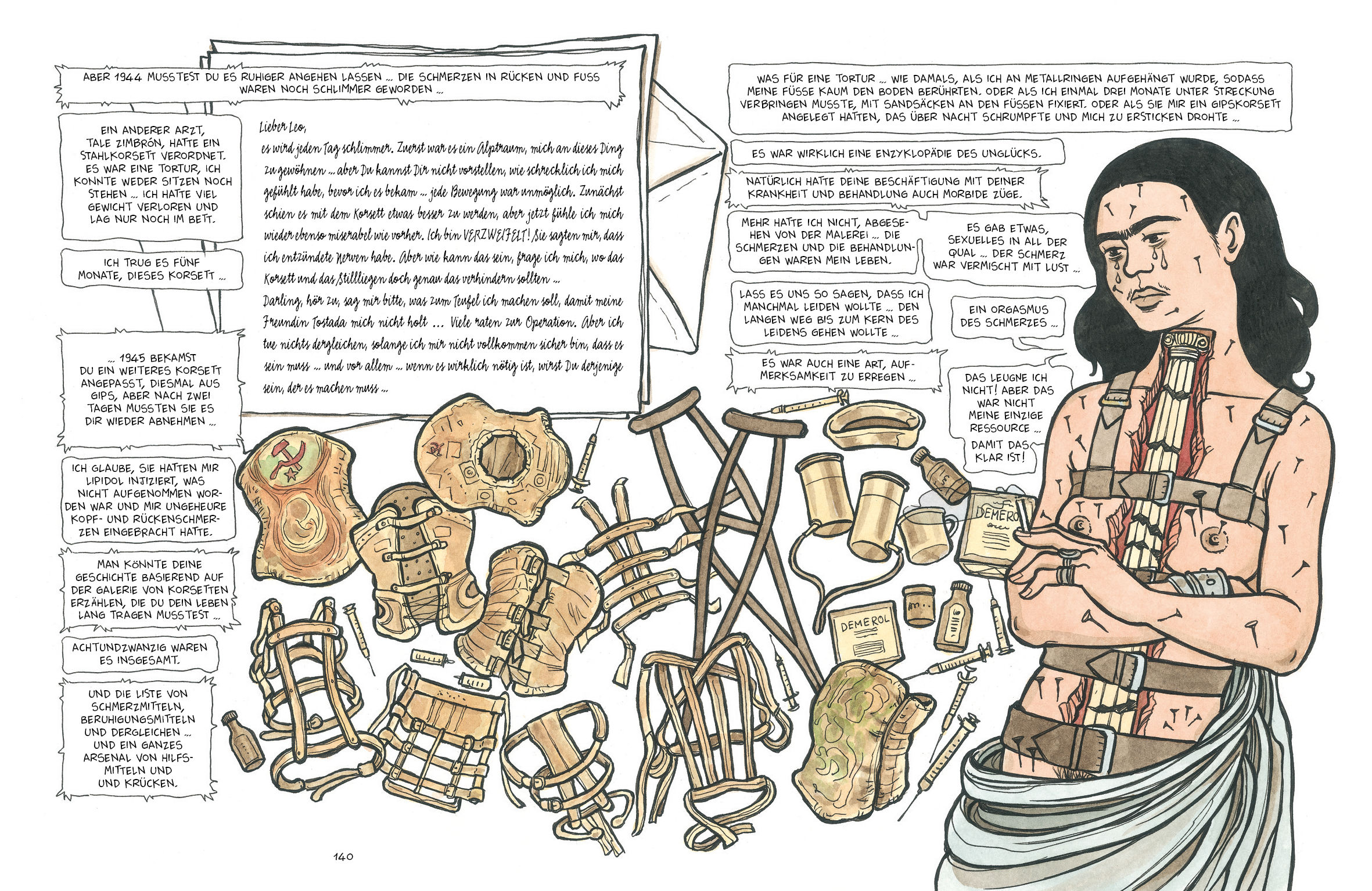 Vanna Vinci nimmt Kahlos Geschichte und ihren künstlerischen Stil als Grundlage für ihre einfühlsame Graphic Novel. In klarer Linienführung und farbenfroher Ausformung erzählt sie von den Stationen in Kahlos Leben, von ihren Fantasien und Sehnsüchten, ihren bestimmenden Themen und Enttäuschungen. Dabei wird nichts ausgelassen – stürmische Affären, Fehlgeburten und Eifersuchtsszenen, Momente des Selbstzweifels und künstlerische Triumphe. In surrealistischer Manier verweben sich Traumsequenzen und Zitate von Kahlos wichtigsten Gemälden mit ihrer Biographie.