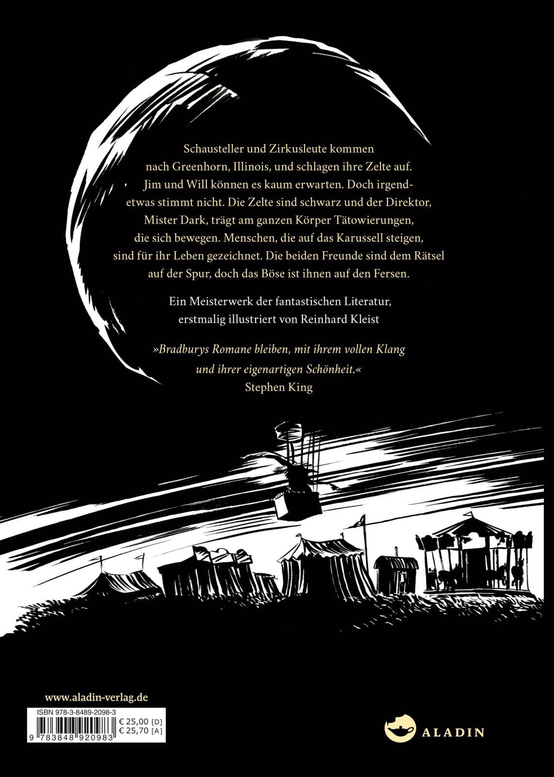 | Schlagworte | Ewige Jugend • Grusel • Gruselgeschichte • Illinois • Jahrmarkt • Jugendthriller • Kinder/Jugendliche: Action- und Abenteuergeschicht • Kinder/Jugendliche: Horror- und Geistergeschichten • Kinder/Jugendliche: Romane, Erzählungen, Tatsachen • Kinder, Jugendliche und Bildung • Manipulation der Zeit • Ray Bradbury • Reinhard Kleist • Science-fiction • Science Fiction • Sehnsucht • Thriller • Verwunschene Karussel • Zauber • Zeitumkehr |