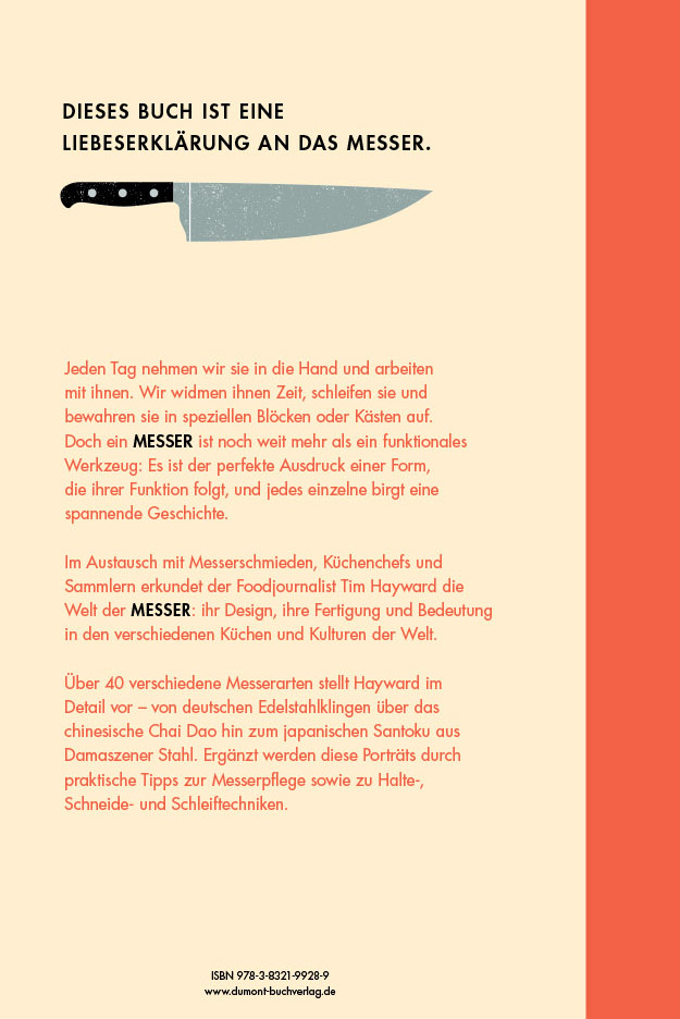 Über vierzig verschiedene Messerarten stellt Hayward im Detail vor – von deutschen Edelstahlklingen über das chinesische Chai Dao hin zum japanischen Santoku aus Damaszener Stahl. Ergänzt werden diese Porträts durch praktische Tipps zur Messerpflege sowie zu Halte-, Schneide- und Schleiftechniken.
