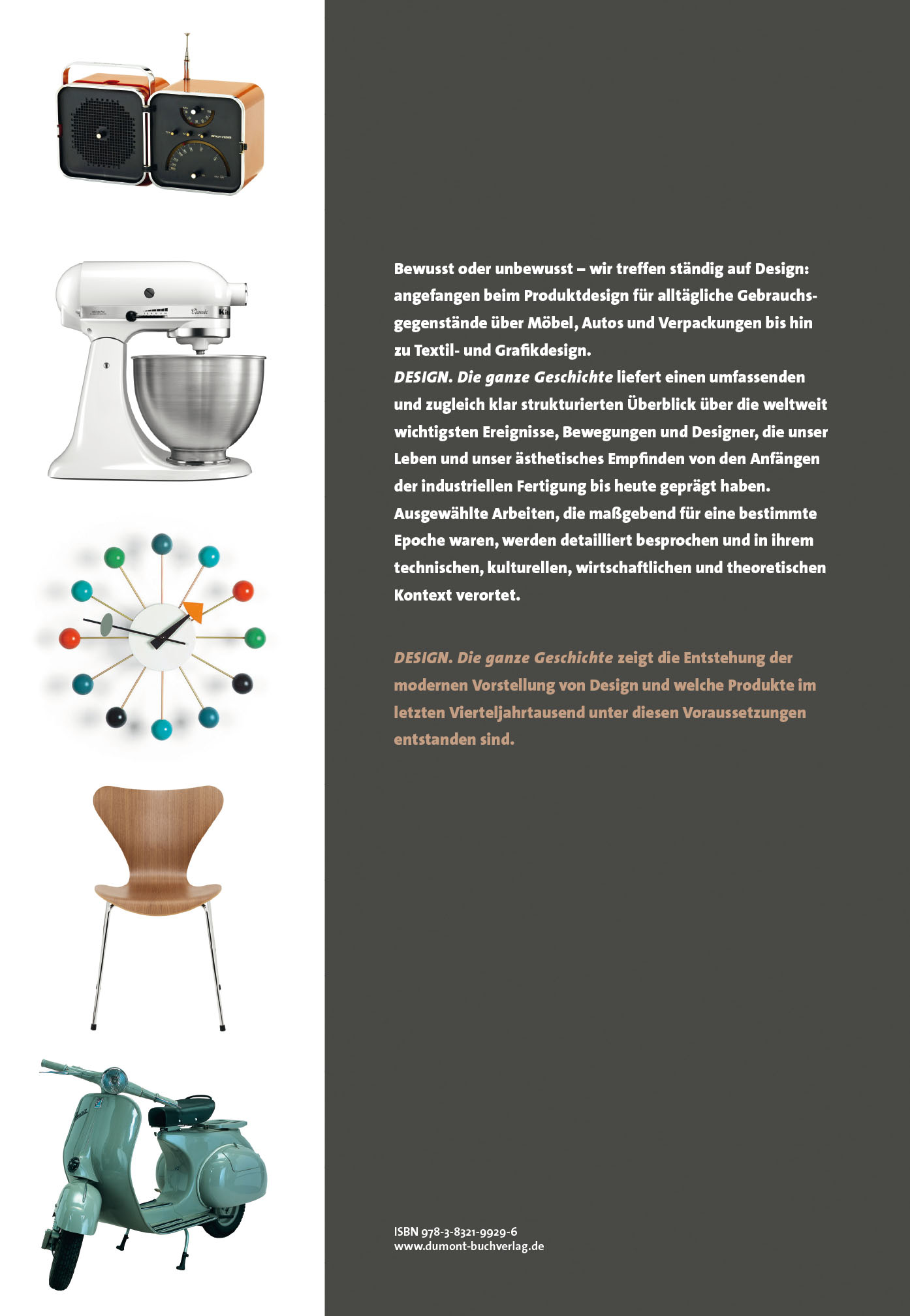 »›Design – Die ganze Geschichte‹ liefert einen umfassenden Überblick über die weltweit wichtigsten Ereignisse, Bewegungen und Designer, die unser Leben und unser ästhetisches Empfinden von den Anfängen der industriellen Fertigung bis heute geprägt haben.«
