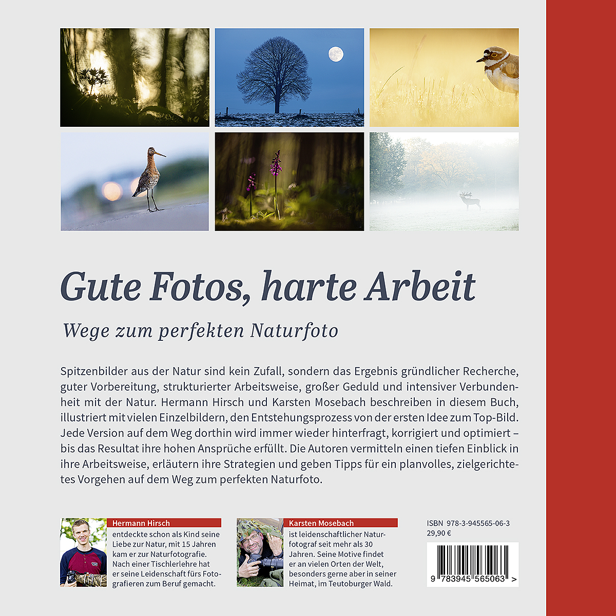 Wer zeigt schon gerne seine weniger gut gelungenen Bilder? Vermutlich präsentieren Sie – nach kritischem Abwägen und wohlbedachter Auswahl – auch lieber die Highlights Ihrer fotografischen Arbeit. Doch bis zu diesen Top-Bildern ist es bekanntlich ein langer Weg. Von diesem Weg berichten die Naturfotografen Hermann Hirsch und Karsten Mosebach im vorliegenden Buch. In Gute Fotos, harte Arbeit öffnen die beiden Naturfotografen ihr Archiv für uns und lassen uns teilhaben an ihren Erfahrungen. Dabei zeigen sie uns auch jene Bilder, die wir normalerweise nicht zu sehen bekommen: die B- und C-Fotos, die unvermeidbaren Versuche, die Fehlschläge auf dem Weg zu den A-Bildern. Dabei gäbe es die Top-Bilder, wie wir sie in Büchern, Magazinen, Wettbewerben und Ausstellungen bewundern, nicht ohne diese scheinbar „schlechten“ Fotos. Von diesen Bildern zu lernen, die Entwicklungsschritte sichtbar und nachvollziehbar zu machen, das war die Aufgabe, die wir uns stellten, als wir dieses Buchprojekt auf den Weg brachten. Die Idee zu diesem Buch: Bei dem Seminar Action- und Verhaltensaufnahmen von Tieren, das Karsten Mosebach in der fotoforum Akademie hielt, folgte ich gespannt seinen Ausführungen. Und ich war fasziniert von seinem methodischen Ansatz: Bild für Bild zeigte er, wie sich ein gutes Foto von der Idee über erste Versuche und die kontinuierliche Optimierung hin zu einem guten Foto entwickeln lässt. Manchmal werden sogar Spitzenbilder daraus. Dabei scheute er sich nicht, auch die weniger gelungenen Varianten zu zeigen. Die Wirkung war verblüffend: immer wenn man meinte, das sei doch nun wirklich ein gutes Bild, wechselte er zum nächsten und zeigte, wie es noch einen Tick besser geht. Dabei bezieht sich Optimierung nicht auf die nachträgliche Bildbearbeitung, sondern auf reale Aufnahmesituationen. Manchmal sind es nur ein paar Zentimeter in der Kameraposition, die den Unterschied zwischen einem guten und einem sehr guten Bild machen. Oder eine kreative Belichtung. Und manchmal ist es wirklich harte Arbeit, teilweise über Wochen und Monate, um die perfekten Bedingungen für ein gutes Foto zu schaffen. Im Anschluss an das Seminar sprachen wir über diese Art der Wissensvermittlung: Genau so stellte ich mir ein Buch vor, das Schritt für Schritt den Weg zum optimalen Naturfoto zeigt. Die Idee war geboren, die Umsetzung konnte beginnen. Oder wie Hermann Hirsch es gerne formuliert: „Gesagt, getan.“ Ihn konnten wir ebenfalls für das Buchprojekt gewinnen. Die Autoren: Hermann Hirsch und Karsten Mosebach sind, auch wenn etwa 25 Lebensjahre die beiden trennen, in ihrer Leidenschaft für Natur und Fotografie eng verbunden. Sie unterstützen sich gegenseitig bei der Planung ihrer Projekte, gehen zusammen auf Fototour und halten sich bei der Bildbesprechung weder mit Kritik noch mit Lob zurück. Und es verbindet beide das Anliegen, mit ihren Bildern auf die Belange der Natur aufmerksam zu machen und für ihren Schutz zu werben. Auch fotografisch verbindet die beiden vieles: Sie setzen Blendenflecken gezielt als Bildelemente ein, lassen Staubkörnchen und Wasserspritzer auf der Linse feine Texturen über das Bild legen und brechen mit gestalterischen Lehrsätzen. Hermann Hirsch und Karsten Mosebach machen technische Unzulänglichkeiten – vermeintliche Fehler – zu ihren Verbündeten. Nicht aus Effekthascherei, sondern weil sie die Fotografie als ein Medium begreifen, das ihnen ein breites Spektrum zwischen Dokumentation und künstlerischer Interpretation der Natur eröffnet. Vor allem aber sind sie immer auf der Suche nach neuen Ansätzen. Das permanente Lernen ist für sie Selbstverständlichkeit und Anreiz zugleich. Beide stehen sie für eine Richtung in der Naturfotografie, in der die Akteure nicht nur Momente und Dinge konkret mit der Kamera festhalten, sondern durch sie hindurch vor allem mit dem Herzen sehen. Hermann Hirsch und Karsten Mosebach haben eine Arbeitsweise verinnerlicht, die heute mehr und mehr zur Selbstverständlichkeit geworden ist. Sie folgt dem Prinzip der Kooperation, des Austauschs und der Vernetzung. Fotografieren in der Natur: Naturfotografie ist ein Geben und Nehmen, nicht nur im kollegialen Sinne unter Fotofreunden, sondern vor allem auch zwischen Fotografen und der Natur. Dass Gesetze zum Schutz der Natur beim Fotografieren eingehalten werden, versteht sich von selbst. Gute Naturfotografie sollte auch immer mit dem tiefen Empfinden und Verstehen der Natur einhergehen. Wenn wir uns in der Natur bewegen, ob als Spaziergänger, Freizeitsportler, Naturschützer oder als Fotograf, sollten wir uns stets so verhalten, dass wir so wenig wie möglich stören. Als Fotografen können wir uns von der Natur nicht nur mit Motiven beschenken lassen, sondern auch etwas zurückgeben. Und zwar in Form von Bildern, die von ihrer Einzigartigkeit und Schutzbedürftigkeit erzählen. Auch von diesem Bemühen und von der Begeisterung für die Natur handelt dieses Buch. Zum Gebrauch dieses Buchs: Gute Fotos, harte Arbeit soll Ihnen auf vielfältige Weise Anregungen für die eigene naturfotografische Praxis geben. So enthält das Buch Beispiele, die sehr einfach realisierbar sind, andere setzen fortgeschrittene Kenntnisse voraus. Einige Themen haben Hermann Hirsch und Karsten Mosebach gemeinsam erarbeitet und für dieses Buch im Dialog reflektiert, andere sind jeweils von einem der beiden alleine fotografiert. Einige Arbeiten sind spontan entstanden, andere mit langer Planung, teilweise über Jahre hinweg. Manche Themen sind technisch einfach darstellbar, andere erfordern eine intensive Auseinandersetzung mit technisch anspruchsvollem Equipment. Die Beiträge in diesem Buch sind nicht als Gebrauchsanleitung zur 1:1-Umsetzung gedacht, vielmehr sollen sie Ihnen zur Inspiration für Ihre eigenen Projekte dienen. Nutzen Sie die Beispiele als Steinbruch, aus dem Sie sich das heraussuchen, was für Sie passt. Kombinieren Sie die Anregungen mit Ihren eigenen Ideen, Themen und Projekten