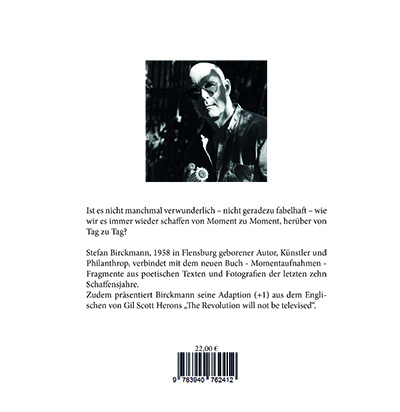 Ist es nicht manchmal verwunderlich - nicht geradezu fabelha - wiewir es immer wieder scha en von Moment zu Moment, herüber vonTag zu Tag?Stefan Birckmann, 1958 in Flensburg geborener Autor, Künstler undPhilanthrop, verbindet mit dem neuen Buch - Momentaufnahmen -Fragmente aus poetischen Texten und Fotogra en der letzten zehnScha ensjahre.Zudem präsentiert Birckmann seine Adaption (+1) aus dem Englischenvon Gil Scott Herons " e Revolution will not be televised".