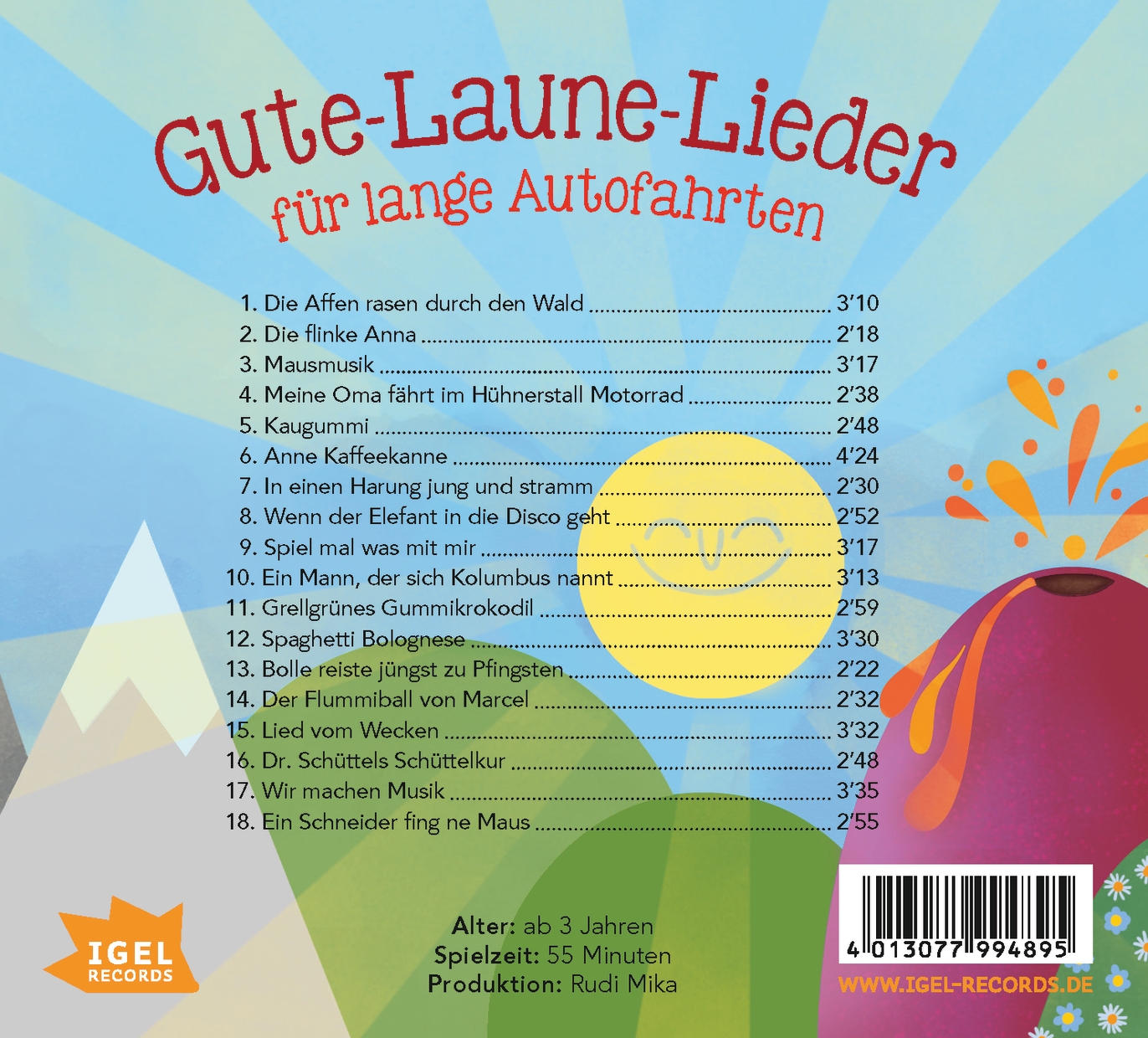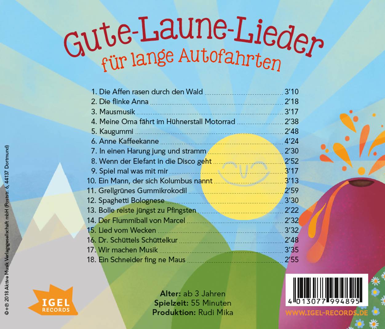 Schluss mit Langeweile im Auto! Sind wir bald da? Wie lange noch? Mir ist langweilig! Mit dieser CD zum Mitsingen und Spaßhaben ist es mit der schlechten Laune auf dem Rücksitz garantiert vorbei. So vergeht jede Autofahrt wie im Flug! Mit den Liedern: - Die Affen rasen durch den Wald - Die flinke Anna - Wir machen Musik - Meine Oma fährt im Hühnerstall Motorrad - Anne Kaffeekanne - Wenn der Elefant in die Disco geht - Grellgrünes Gummikrokodil