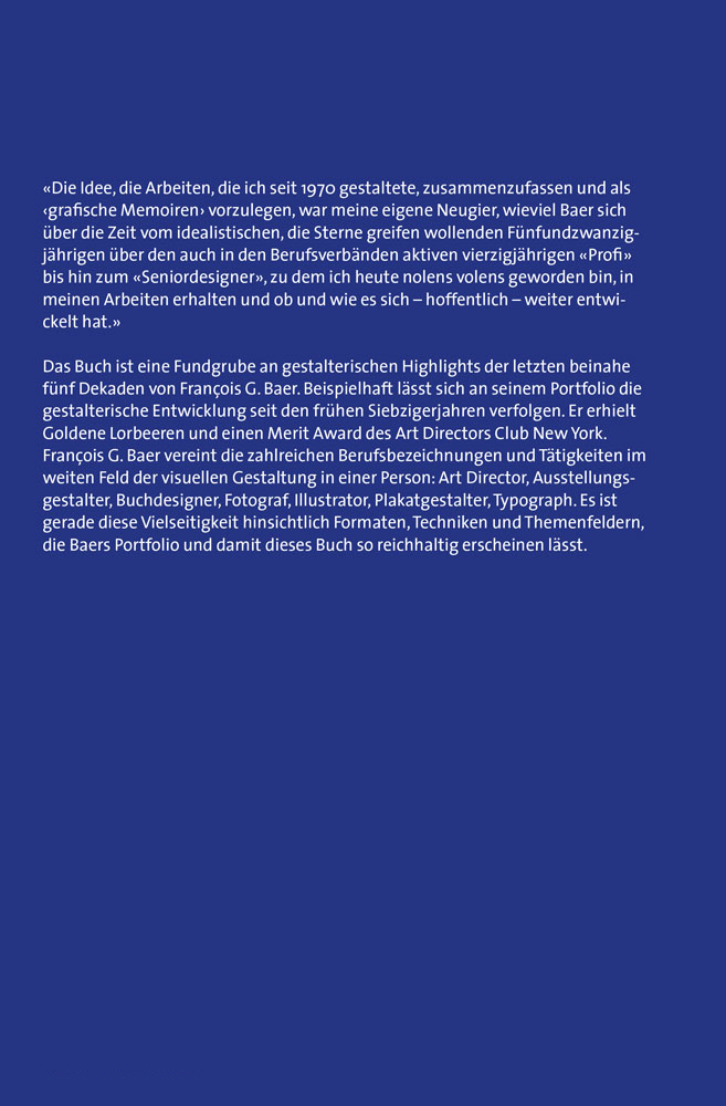 Das Buch ist eine Fundgrube an gestalterischen Highlights der letzten beinahe fünf Dekaden von François G. Baer. Beispielhaft lässt sich an seinem Portfolio die gestalterische Entwicklung seit den frühen Siebzigerjahren verfolgen. Er erhielt Goldene Lorbeeren und einen Merit Award des Art Directors Club New York. François G. Baer vereint die zahlreichen Berufsbezeichnungen und Tätigkeiten im weiten Feld der visuellen Gestaltung in einer Person: Art Director, Ausstellungsgestalter, Buchdesigner, Fotograf, Illustrator, Plakatgestalter, Typograph. Es ist gerade diese Vielseitigkeit hinsichtlich Formaten, Techniken und Themenfeldern, die Baers Portfolio und damit dieses Buch so reichhaltig erscheinen lässt.