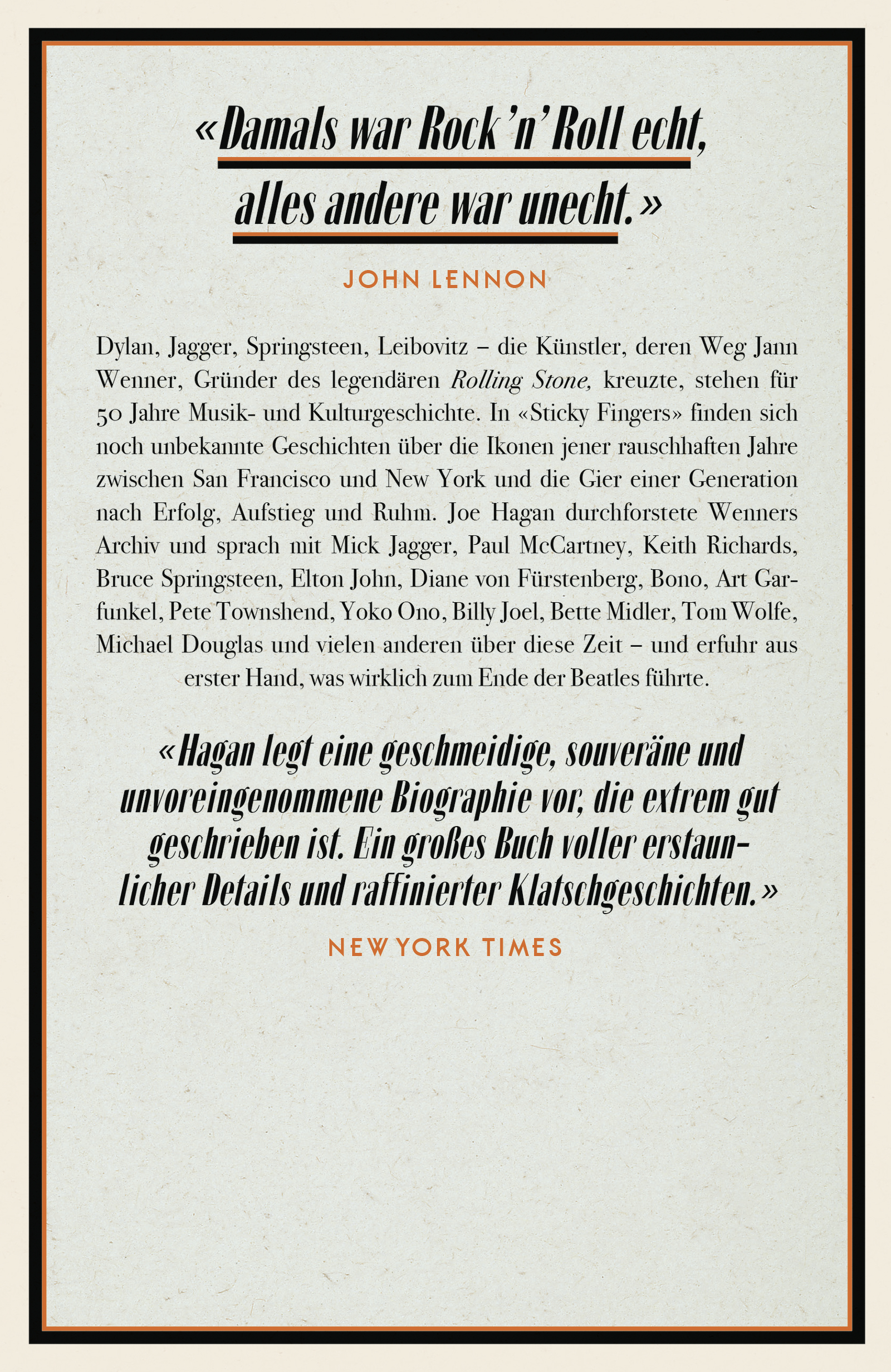Dylan, Jagger, Springsteen, Leibovitz - die Künstler, deren Weg Jann Wenner, Gründer des legendären Rolling Stone Magazine, kreuzte, stehen für 50 Jahre Musik- und Kulturgeschichte. In «Sticky Fingers» finden sich noch unbekannte Geschichten über die Ikonen jener rauschhaften Jahre zwischen San Francisco und New York und die Gier einer Generation nach Erfolg, Aufstieg und Ruhm. Joe Hagan durchforstete Wenners Archiv und sprach mit Mick Jagger, Paul McCartney, Keith Richards, Bruce Springsteen, Elton John, Diane von Fuerstenberg, Bono, Art Garfunkel, Pete Townshend, Yoko Ono, Billy Joel, Bette Midler, Tom Wolfe, Michael Douglas und vielen anderen über diese Zeit - und erfuhr aus erster Hand, was wirklich zum Ende der Beatles führte.