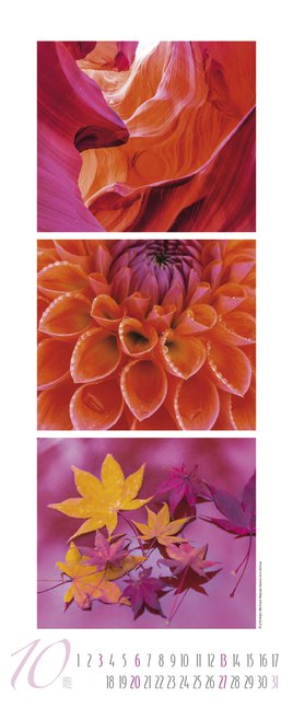 Die kunstvoll zusammengestellten Colour Triplets in diesem Kalender sind ein Wandschmuck der Superlative. Jedes Monatsblatt zeigt eine neue, perfekt abgestimmte Farbsymphonie aus Detailfotografien international bekannter Topfotografen.