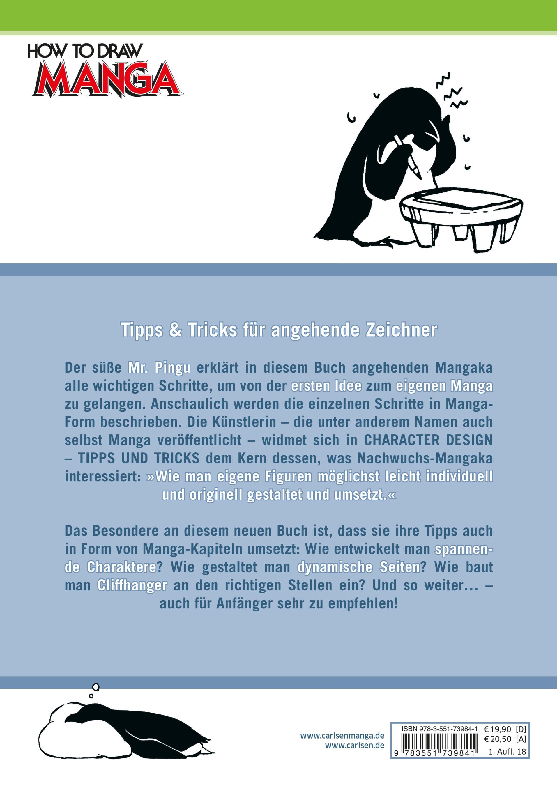 Der süße Mr. Pingu erklärt in diesem Buch angehenden Mangaka alle wichtigen Schritte, um von der ersten Idee zum eigenen Manga zu gelangen. Anschaulich werden die einzelnen Schritte in Manga-Form beschrieben. Die Künstlerin - die unter anderem Namen auch selbst Manga veröffentlicht - widmet sich in CHARACTER DESIGN - TIPPS UND TRICKS dem Kern dessen, was Nachwuchs-Mangaka interessiert: »Wie man eigene Figuren möglichst leicht individuell und originell gestaltet und umsetzt.« Das Besondere an diesem neuen Buch ist, dass sie ihre Tipps auch in Form von Manga-Kapiteln umsetzt: Wie entwickelt man spannende Charaktere? Wie gestaltet man dynamische Seiten? Wie baut man Cliffhanger an den richtigen Stellen ein? Und so weiter... - auch für Anfänger sehr zu empfehlen!