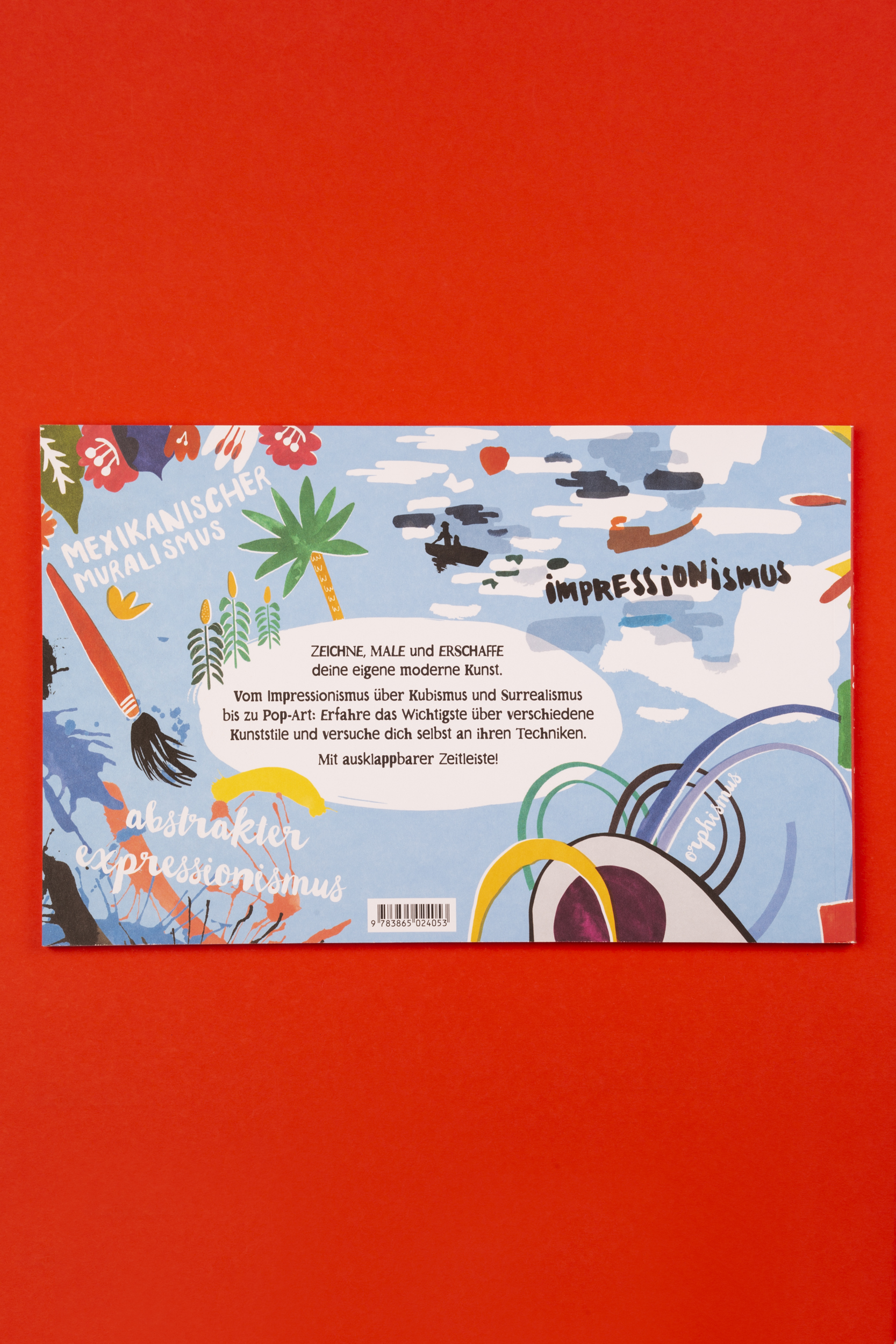 Expressionismus, Impressionismus, Surrealismus, Kubismus, Fauvismus und abstrakte Malerei: Bei diesem kreativen Streifzug durch die Kunstgeschichte können Kinder aktiv in unterschiedliche Stilrichtungen eintauchen und Malweisen und Techniken wie Pointillismus oder Action Painting ausprobieren. Auf knallbunten, zum Malen anregenden Buchseiten lassen sich schöne Werke gestalten. Währenddessen prägen sich die verschiedenen Strömungen zeitgenössischer Kunst, zum Beispiel Mexikanischer Muralismus und Graffiti, leicht ein. Oder die Künstlergruppen Cobra und De Stijl. Mit Wasserfarben, Filzstiften oder Ölkreiden lassen sich tolle Werke produzieren, ebenso können Kunstlehrer hier Ideen für die praktische Vermittlung von Kunstgeschichte finden. Die ausklappbare Zeitleiste am Ende des Buches zeigt chronologisch die Kunstepochen und wichtigsten Künstler von Edgar Degas bis Banksy, Damien Hirst und Shepard Fairey.