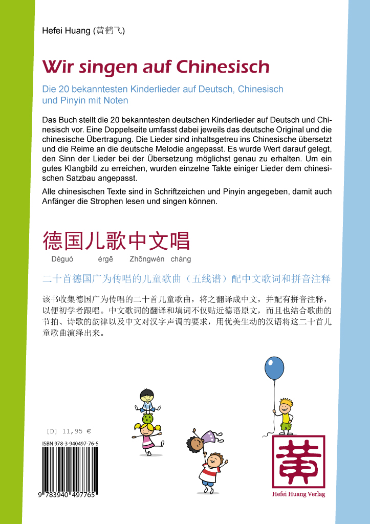 Das Buch stellt die 20 bekanntesten deutschen Kinderlieder auf Deutsch und Chinesisch vor. Eine Doppelseite umfasst dabei jeweils das deutsche Original und die chinesische Übertragung. Die Lieder sind inhaltsgetreu ins Chinesische übersetzt und die Reime an die deutsche Melodie angepasst. Es wurde Wert darauf gelegt, den Sinn der Lieder bei der Übersetzung möglichst genau zu erhalten. Um ein gutes Klangbild zu erreichen, wurden einzelne Takte einiger Lieder dem chinesischen Satzbau angepasst. Alle chinesischen Texte sind in Schriftzeichen und Pinyin angegeben, damit auch Anfänger die Strophen lesen und singen können.