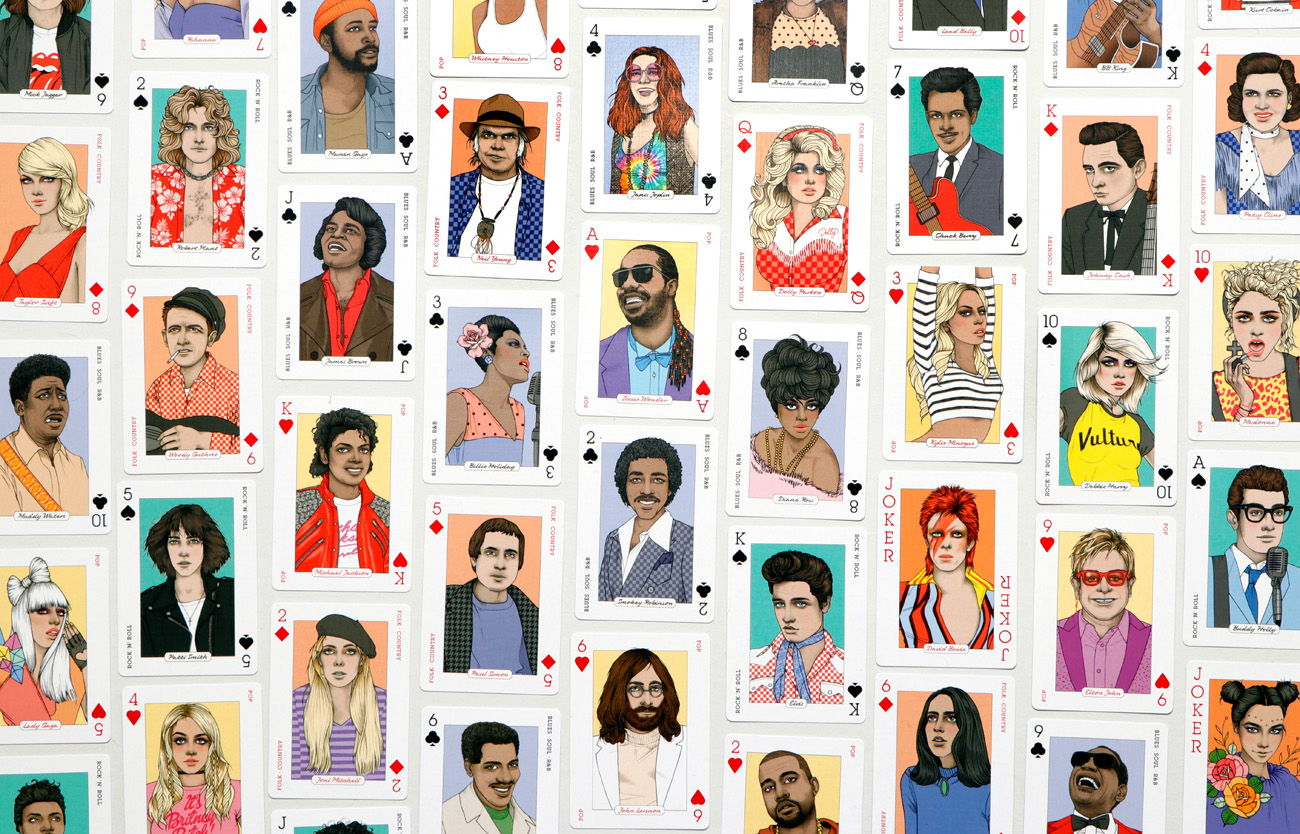 | Schlagworte | Bob Dylan • David Bowie • Folk • Illustration • Kartenspiel • Kurt Cobain • Madonna • Mau Mau • Musiker • Musikgenres • Musikgeschichte • Pop • Prince • Rock'n Roll • Soul • Stars |