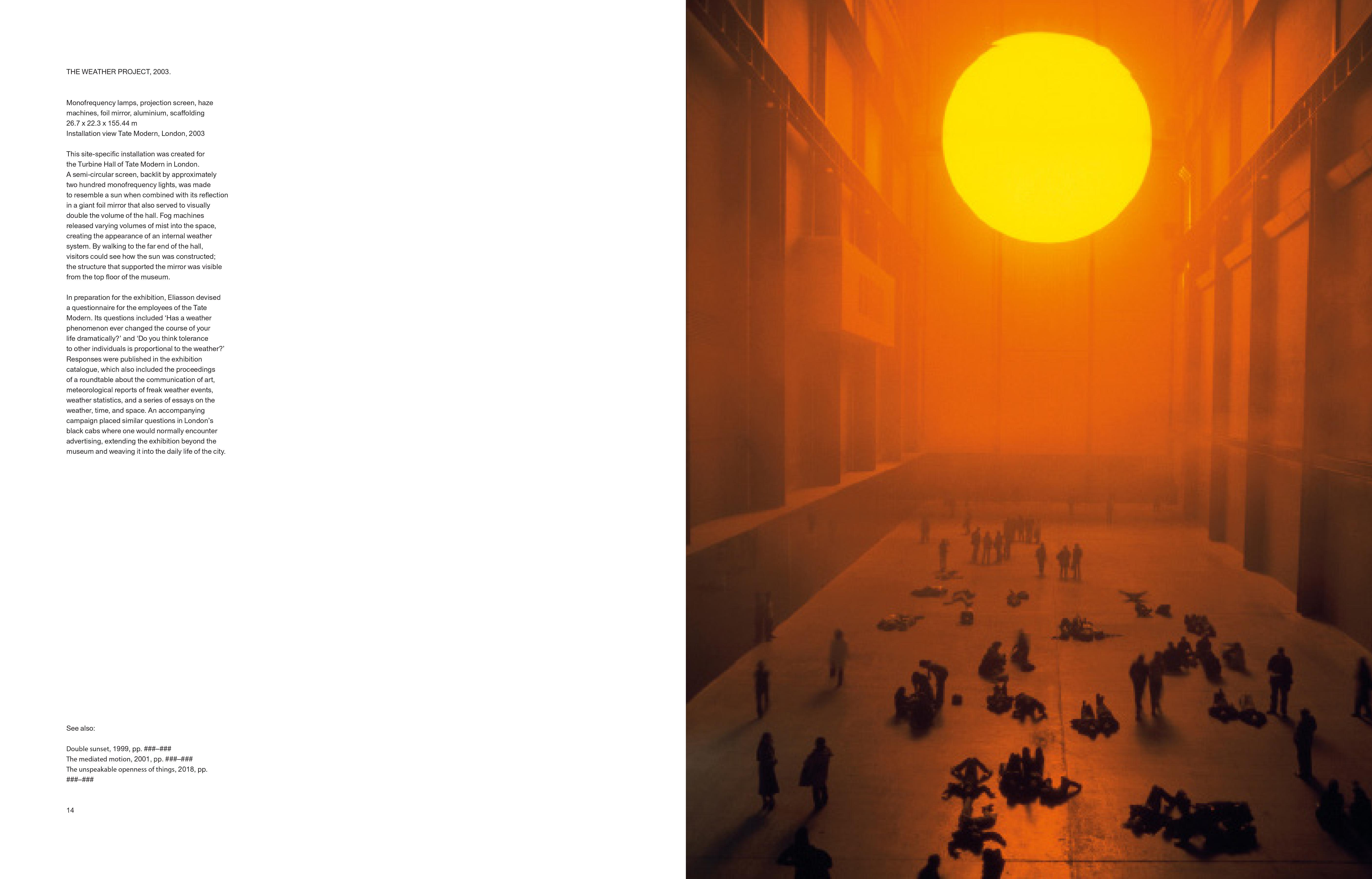 Experience spans Eliasson's career to date via images of his installations, sculptures, paintings, photographs, films, architectural projects, and interventions in public space - each with an extended caption to guide readers through the work