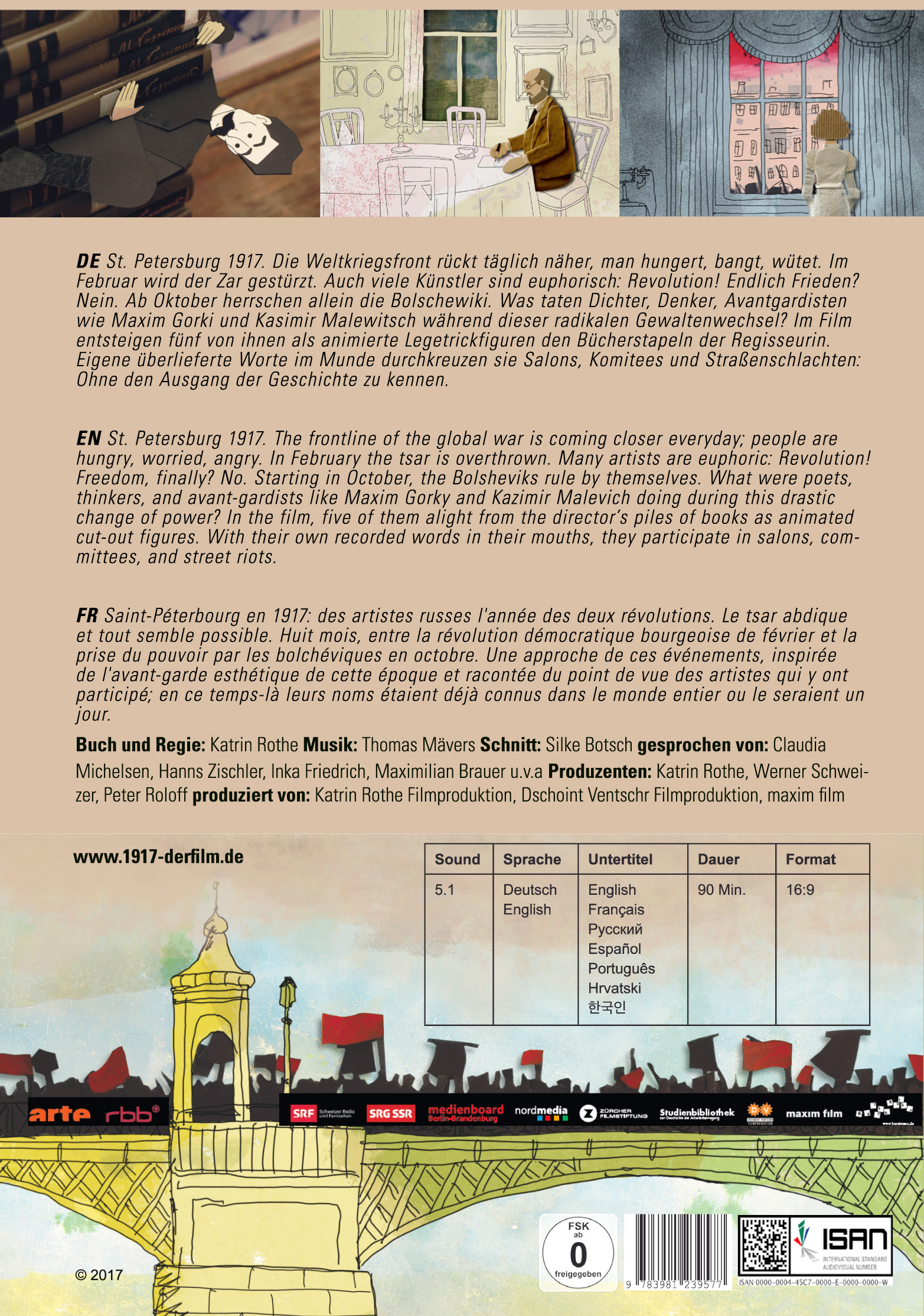 English and German dialogue versions. Subtitels: English, Français, Pусский, Español, Português, Hrvatski, 한국인 (Corean) Saint-Pétersbourg, 1917 : des artistes russes l’année des deux révolutions. Le tsar capitule et tout semble possible. Huit mois entre la révolution démocratique bourgeoise de février et le coup d’État bolchévique en octobre. Une approche artistique filmatographique de ces événements, racontée du point de vue des artistes concernés, dont les noms sont déjà connus dans le monde entier à l’époque ou qui le seront bientôt. St. Petersburg 1917. Die Weltkriegsfront rückt täglich näher, man hungert, bangt, wütet. Im Februar wird der Zar gestürzt. Auch viele Künstler sind euphorisch: Revolution! Freiheit! Endlich Frieden? Nein. Ab Oktober herrschen allein die Bolschewiki. Was taten Dichter, Denker, Avantgardisten wie Maxim Gorki und Kasimir Malewitsch während dieser radikalen Gewaltenwechsel? Im Film entsteigen fünf von ihnen als animierte Legetrickfiguren den Bücherstapeln der Regisseurin. Eigene überlieferte Worte im Munde durchkreuzen sie Salons, Komitees und Straßenschlachten: ohne den Ausgang der Geschichte zu kennen.