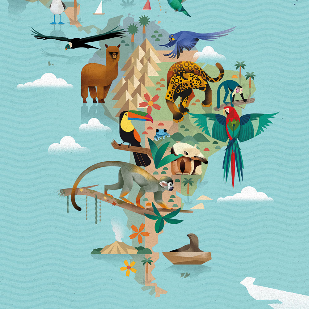 Eine Weltkarte mit den schönsten und interessantesten Tieren aus allen Regionen der Erde. Liebevoll illustriert von Dieter Braun.