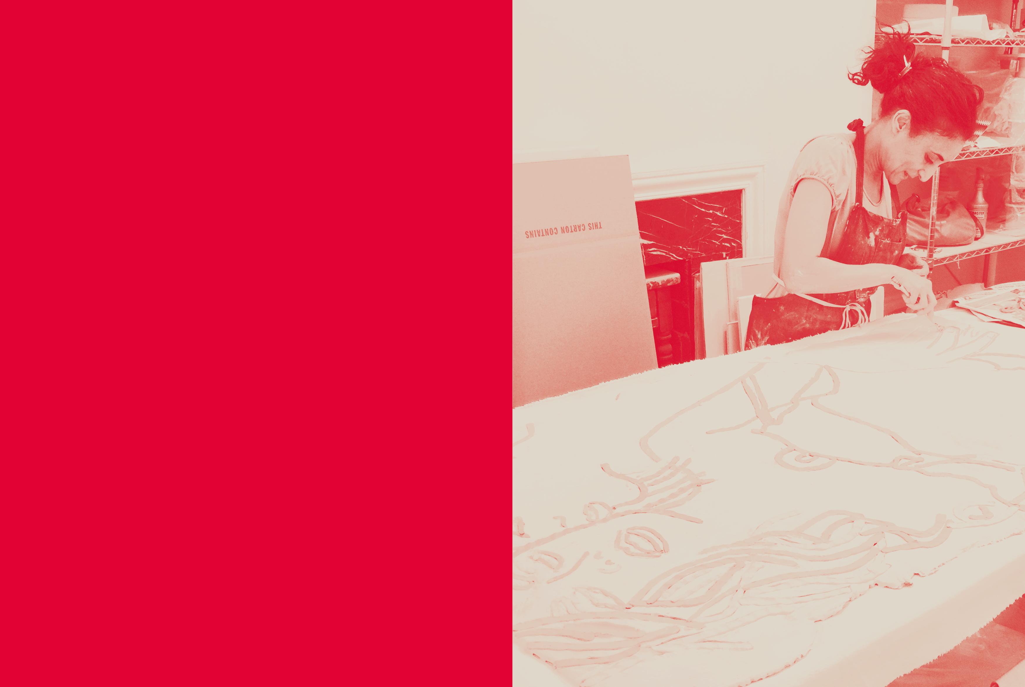 Internationale Bekanntheit erlangte Ghada Amer (geb. 1963 in Kairo, Ägypten) Mitte der 1990er-Jahre mit Darstellungen erotischer Motive, die sie auf ihre Gemälde stickte. Seit 2014 arbeitet die Künstlerin mit dem Werkstoff Ton. Zunächst produzierte sie abstrakte, farbige Tonskulpturen mit grobkörnigen Konturen; während eines zweijährigen Aufenthalts an der Greenwich House Pottery in New York entstanden dann Werke, die in der Kunst- wie der Keramikwelt beispiellos sind. Amer verwendet großformatige, dünne Tonplatten, deren Verarbeitung äußerst schwierig ist. Hierauf malt sie beidseitig Frauenporträts und biegt die Platten so, dass sie aufrecht stehen können.
