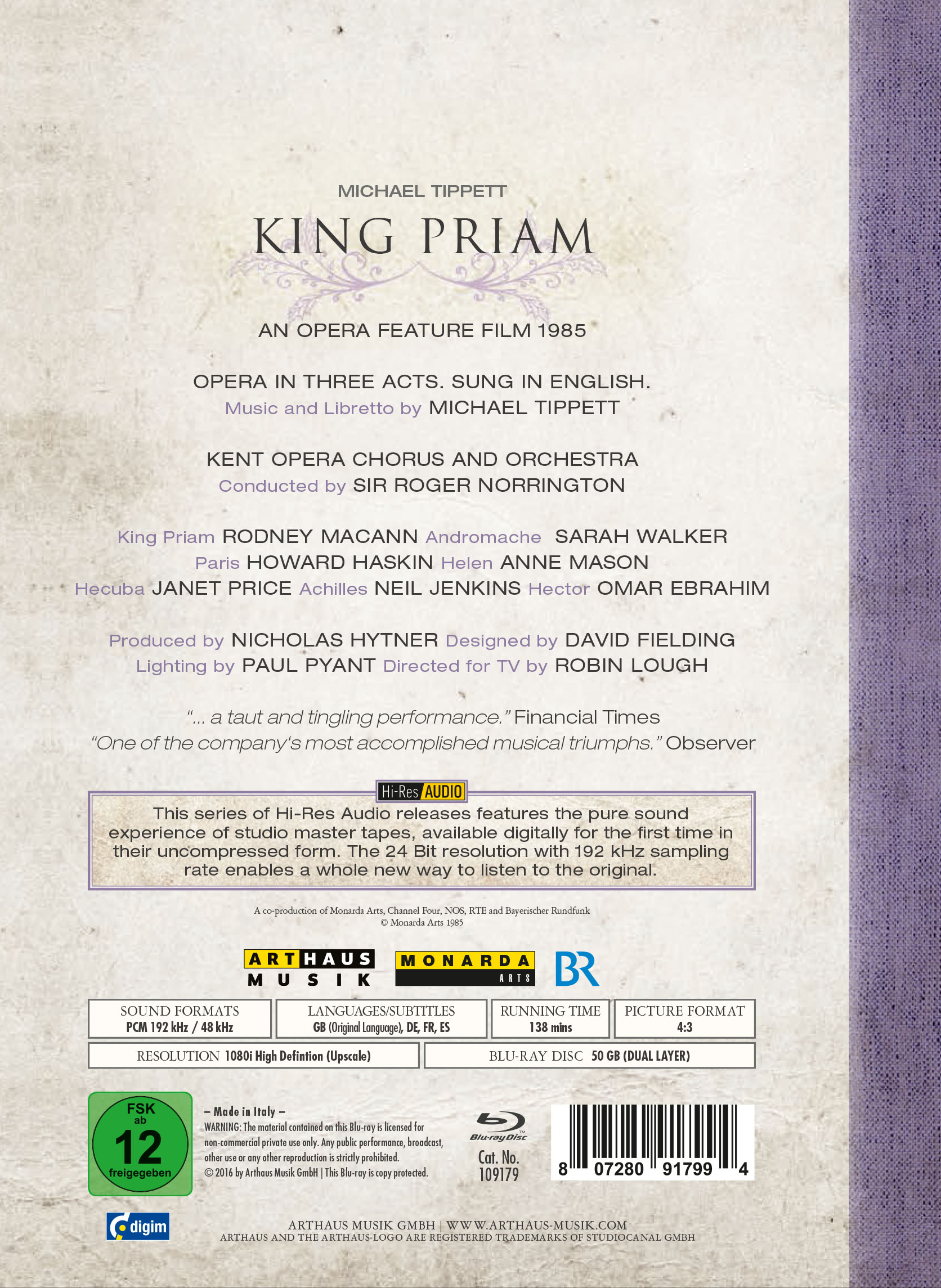 Nicholas Hytner’s innovative production is matched by the starkly stylised setting designed by David Fielding, which creates a timeless arena of war. Minimal costume and colour, frozen action and white light further enhance Tippett’s marvellously sparse music played with fearless conviction and driving impetus by the youthful Kent Opera Orchestra under the direction of Roger Norrington. Die erzählerische Vorlage für diese Oper von Michael Tippett stammt aus der Ilias, dem homerischen Epos vom Trojanischen Krieg. Die Geschichte wird nur teilweise nacherzählt, die Handlung konzentriert sich ganz auf die emotionalen Stadien ihrer Figuren - deren Liebschaften, Treueschwüre und Rachegelüste, die am Ende zum Tod von König Priamos in seiner brennenden Stadt führen. Thematisiert werden die Unvermeidbarkeit und die Sinnlosigkeit des Krieges.
