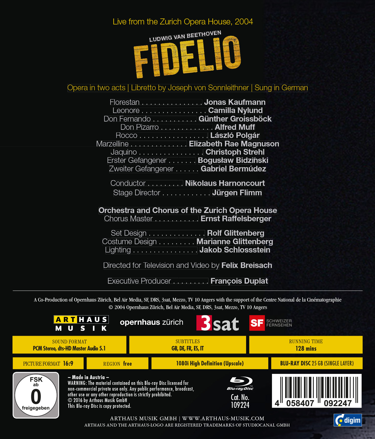 Beethoven’s only opera Fidelio never ceases to fascinate audiences with its spellbinding story of true love. Staged by renowned opera director Jürgen Flimm this production is the outstanding result of the teamwork of the orchestra and chorus of the Zurich opera with a cast of magnificent singer-actors. Finnish soprano Camilla Nylund in the title role presents a wonderful portrayal of the opposing characters of the loving wife, Leonore, and her alter ego, the young man Fidelio. Jonas Kaufmann who has lately gained international fame is her counterpart Florestan – the attractive tenor plays a convincing suffering prisoner, brought back to life by marital love. László Polgár is the jailer, torn between greed and sympathy and Alfred Muff takes on the sinister Don Pizarro to complete the setting.