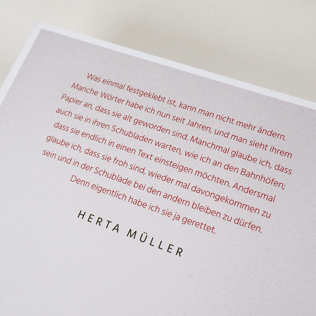 "Kurz nachdem ich aus Rumänien kam, war ich viel unterwegs. Ich wollte mich bei Freunden melden", schreibt Herta Müller. "Aber die Ansichtskarten hatten so gräßlich mißratene Farben. Eines Tages kaufte ich weiße Karteikarten, einen Klebestift und fing an, im Zug mit der Nagelschere aus der Zeitung ein Schwarzweiß-Bild und Wörter auszuschneiden." Fortan dichtet sie mit Schere und Papier. Herta Müllers berühmte Collagen sind beides zugleich: Kunstwerk und Gedicht, Spiel und poetischer Ernst. Und unversehens taucht im geklebten Gedicht das auf, worum es eigentlich geht: die Wirklichkeit - denn "vielleicht haben auch Wörter ein schimmerndes Gemüt und betreiben Amtsmissbrauch..."