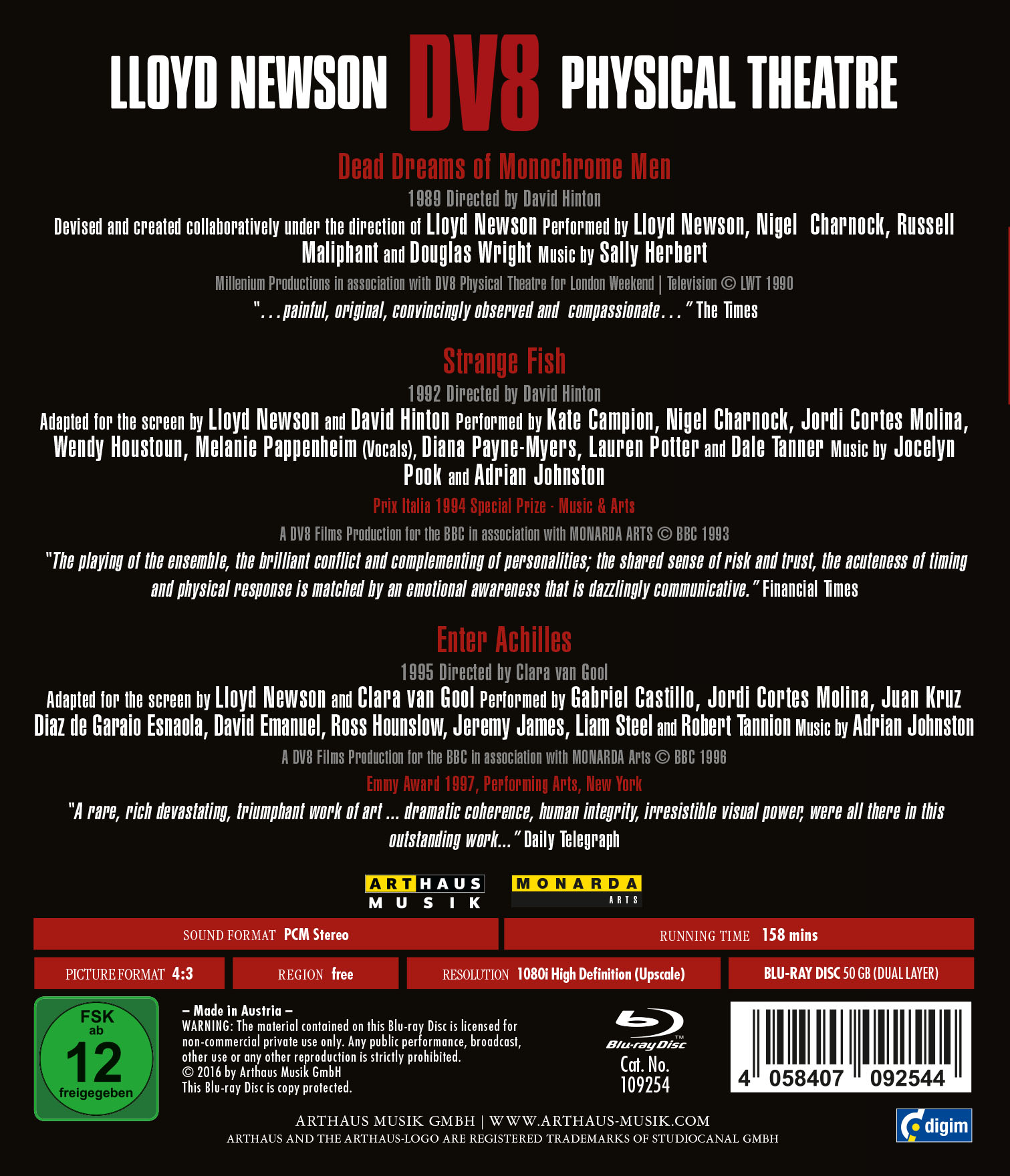 Dead Dreams of Monochrome Men (1989) beginnt mit begehrlichen Blicken in einer Gay-Bar und endet mit einem kurzen Blick zwischen geschlossenen Vorhängen der Wohnung hinaus auf die sonnige, menschenleere Straße. Am Anfang von Strange Fish (1992) hängt eine halbnackte Frau in Christus-Pose am Kreuz und singt. Das Stück endet mit einer ähnlichen Szene, in deren Verlauf die Frau bäuchlings auf dem harten, staubigen Boden liegt – heruntergeschüttelt von der Protagonistin (Wendy Houston), die den Mann zum Lieben sucht und statt dessen von alptraumhaften, biblischen Plagen heimgesucht wird. Enter Achilles (1995) startet „after work“ in einem Pub, in dem sich Männer zum Bier, zu Karaoke und Männlichkeitsritualen treffen (der Untertitel lautet bezeichnenderweise Was es heißt, ein Mann zu sein), und endet am nächsten Morgen mit Blick von außen auf den Club. In diesen geschlossenen Räumen entfaltet Lloyd Newson seine Psychodramen. Nackt und kahl, strukturiert von Licht und Schatten, einer Wand, einem Durchblick, einer Wanne in Dead Dreams of Monochrom Men, leer, verstaubt und verlassen das Hotel in Strange Fish, altmodisch-plüschig und realitätsnah der Pub in Enter Achilles. Wild agieren die Figuren, die diese Räume bevölkern, und gieren heftig nach Nähe, Zärtlichkeit und Anerkennung.