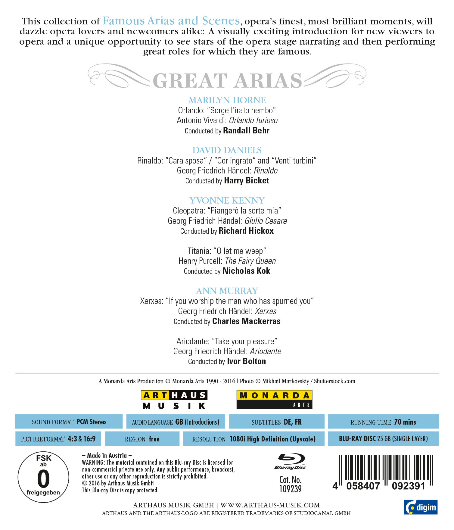 Collected here are Famous Baroque Arias and Scenes. They feature works by Händel, Purcell and Vivaldi and the artists David Daniels, Marilyn Horne, Yvonne Kenny and Ann Murray.