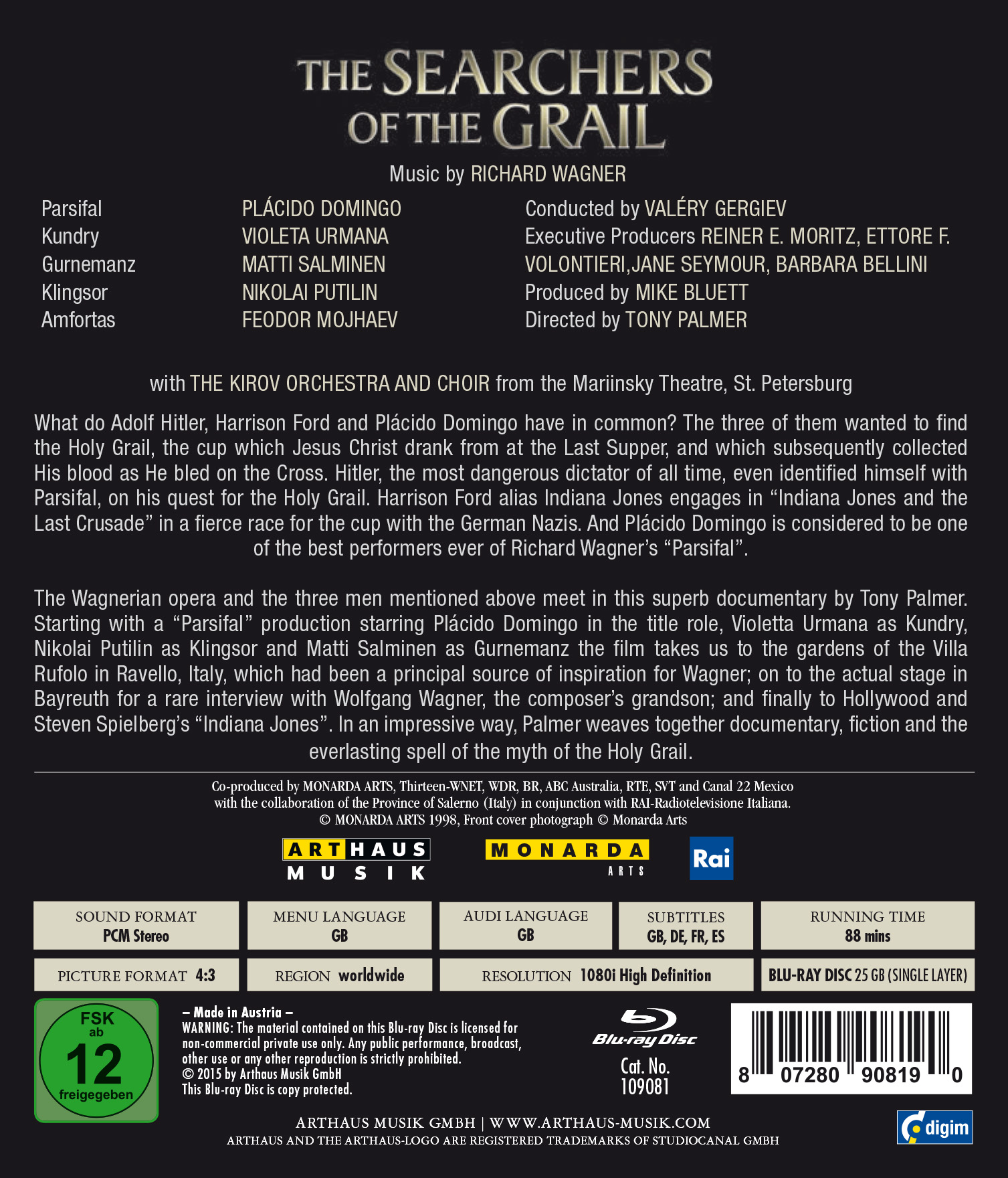 Richard Wagners Oper und die drei Männer treffen sich nun in „The Searchers of the Grail“, einem grandiosen Dokumentarfilm von Tony Palmer. Ausgehend von einer „Parsifal“-Inszenierung mit Plácido Domingo in der Titelrolle, Violetta Urmana als Kundry, Nikolai Putilin als Klingsor und Matti Salminen als Gurnemanz führt der Film in die Gärten der Villa Rufolo in Ravello, Italien, einer wichtigen Inspirationsquelle für Wagners Schaffen, auf die Bühne in Bayreuth zu einem seltenen Interview mit Wolfgang Wagner, dem Enkelsohn des Komponisten und schließlich nach Hollywood zu Steven Spielbergs „Indiana Jones“. Auf eindrucksvolle Weise verwebt Palmer Dokumentation und Fiktion mit der immerwährenden Faszination von dem Mythos um den Heiligen Gral.