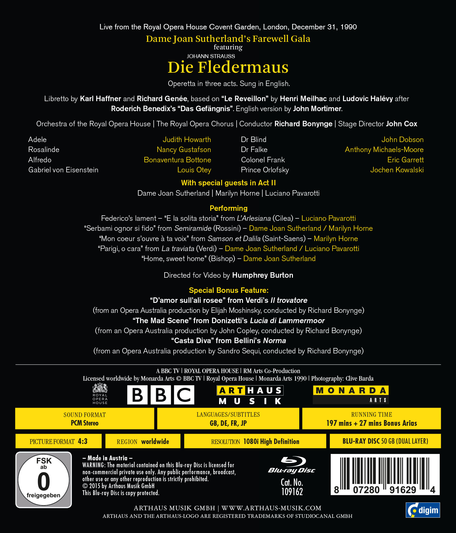 After its first performance in Vienna, the operetta Die Fledermaus set out to conquer the world. It is one of the few operettas which are regularly staged by the great opera houses of the world such as the New York Metropolitan Opera, the Milan Scala, The Staatsoper in Vienna and the Royal Opera House Covent Garden in London. In 1977 John Cox directed the piece in London with a lavish production using a stage set of Julia Trevelyan Oman. On New Year’s Eve of 1990 this production gave the luxurious setting for Joan Sutherland’s farewell from her London audience which had admired the singer since her great success at this famous opera house in the fifties. The glittering party in the second act of Die Fledermaus reached its high point during her tumultuously applauded appearance and the engagement of her friends and colleagues Luciano Pavarotti and Marilyn Horne with whom she had often appeared together on stage. Die Fledermaus eroberte sich nach der Wiener Uraufführung die Welt. Sie gehört zu den wenigen Operetten, die auch an den bedeutenden Opernhäusern wie der Metropolitan Opera, der Mailänder Scala, der Wiener Staatsoper und auch am Royal Opera House Covent Garden in London regelmäßig gespielt werden. John Cox führte 1977 in London bei einer verschwenderisch ausgestatteten Produktion die Regie im Bühnenbild von Julia Trevelyan Oman. Diese Inszenierung bot am Sylvesterabend 1990 das luxuriöse Ambiente für den Abschied von Joan Sutherland von ihrem Londoner Publikum, das die Sängerin seit ihren ersten großen Erfolgen an diesem renommierten Opernhaus in den fünfziger Jahren verehrte. Das rauschende Fest im zweiten Aufzug der Fledermaus erreichte seinen Höhepunkt durch ihren stürmisch umjubelten Auftritt und der Verpflichtung ihrer Freunde und Kollegen Luciano Pavarotti und Marilyn Horne, mit denen sie häufig zusammen auf der Bühne gestanden hat.