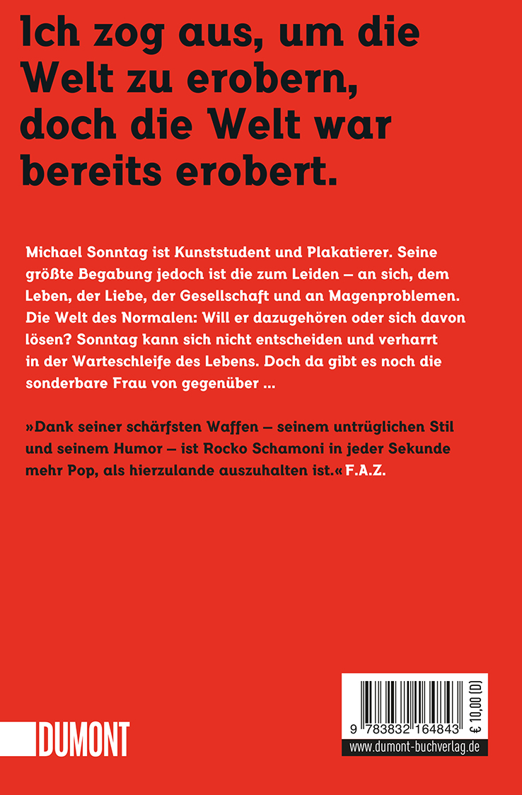 Rocko Schamoni, 1966 in Deutschland geboren, veröffentlichte zahlreiche CDs, arbeitet für Theater, Film und Fernsehen, tourt regelmäßig solo oder mit Band durch die Republik und hat inzwischen eine eingeschworene Fangemeinde. Er veröffentlichte die Romane „Risiko des Ruhms" (2000), „Dorfpunks" (2004) und „Sternstunden der Bedeutungslosigkeit" (DuMont 2007).