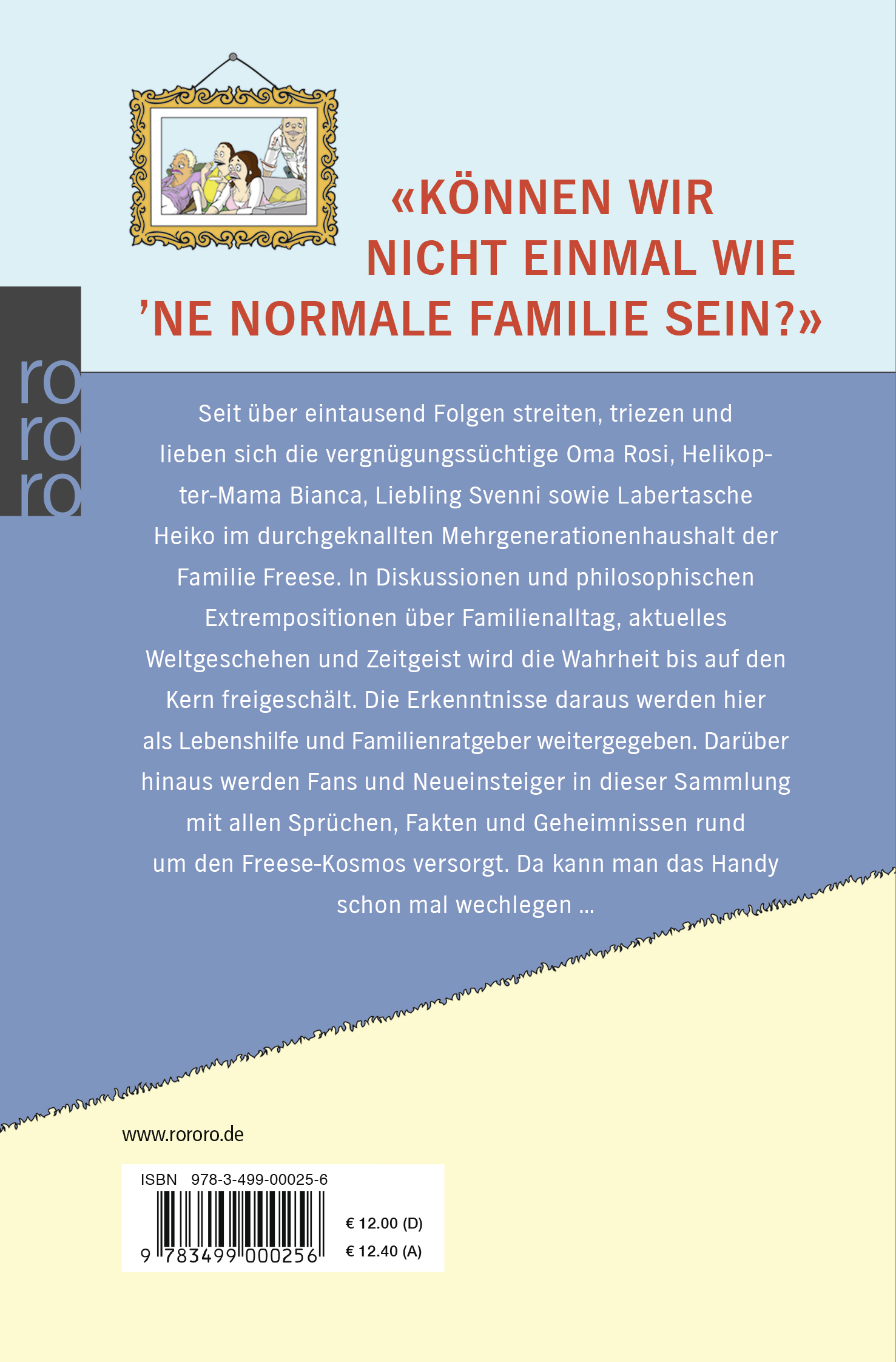 Das Kultbuch zum erfolgreichen Comedy-Format "Die Freeses" bei NDR2! Hier finden die Fans die lustigsten Dialoge, die besten Sprüche, die größten Weisheiten der Familie Freese. Zur Familie gehören Oma Rosi, die ein eigenes Taxiunternehmen führt, die alleinerziehende Mutter Bianca und der zwölfjährige Svenni, der manches Mal als einziger den Durchblick hat. Und nicht zu vergessen: Untermieter Heiko. In ihren Gesprächen am heimischen Küchentisch oder in ihrer Lieblingskneipe "Zur Eule" geht es um Strategien der Alltagsbewältigung, tagesaktuelles Geschehen und philosophische Extrempositionen - hier tobt sich Allzumenschliches aufs Komischste aus.