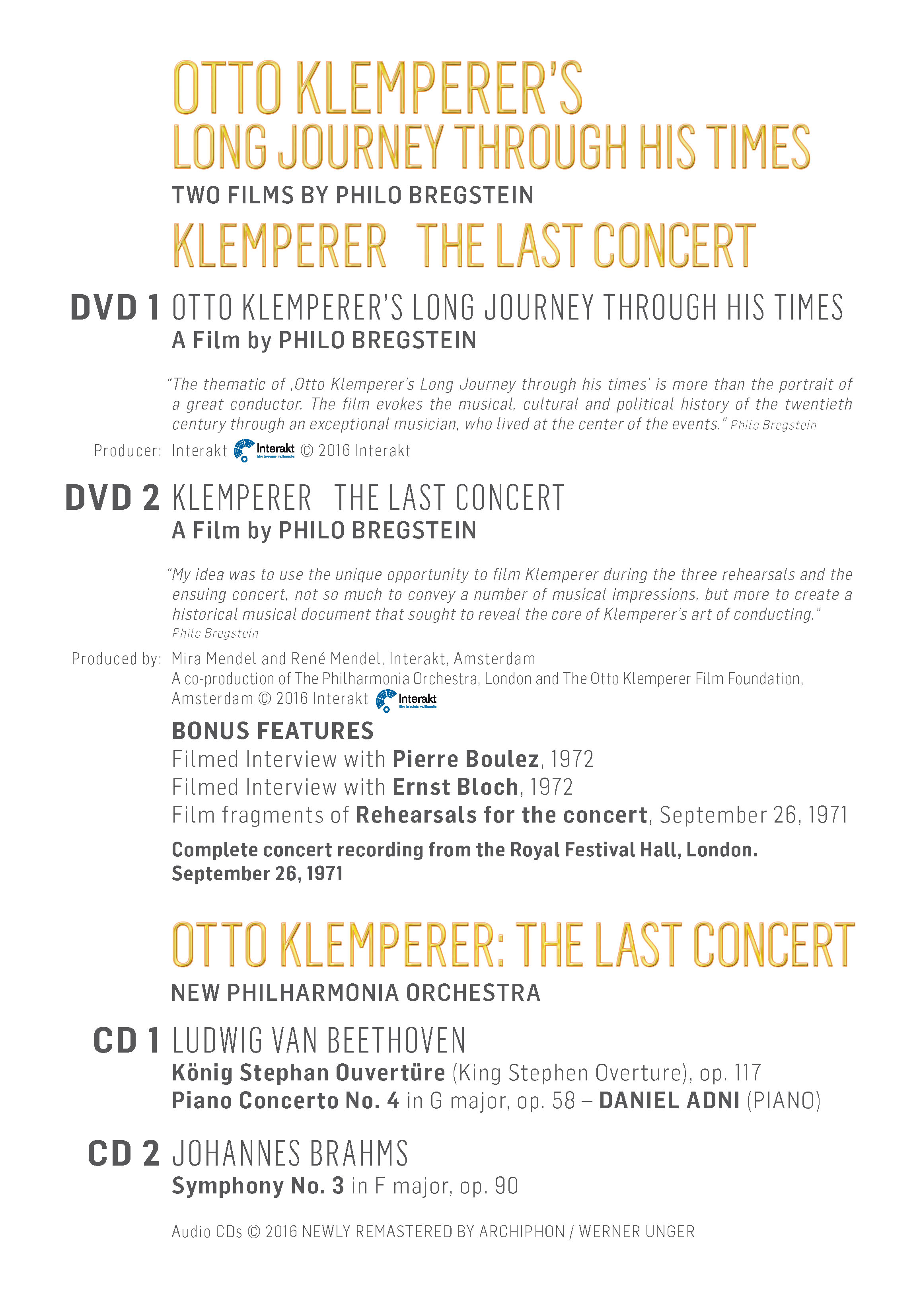 KLEMPERER THE LAST CONCERT ist mit seinem exklusiven Filmmaterial mit Proben und dem tatsächlich letzten Konzert Klemperers am 26. September 1971 in London eine Dokumentation, die als Klemperers musikalisches Testament im Film angesehen werden kann. Nur einige Monate vorher hatte Klemperer seine lebenslange Abneigung dagegen, gefilmt zu werden, abgelegt und Philo Bregstein erlaubt, ihn filmisch zu begleiten. Die Geschichte und Entstehung beider Filme, Klemperers eigener Stellenwert als musikalischer Visionär und sein Vermächtnis an die Musikergenerationen nach ihm werden im 180-seitigen Buch in dieser einzigartigen Edition erläutert. Das Buch vereint Einführungen des Regisseurs und seines Teams und besondere, ausführliche Beiträge von renommierten Musikwissenschaftlern mit einer großen Anzahl an seltenem Fotomaterial.