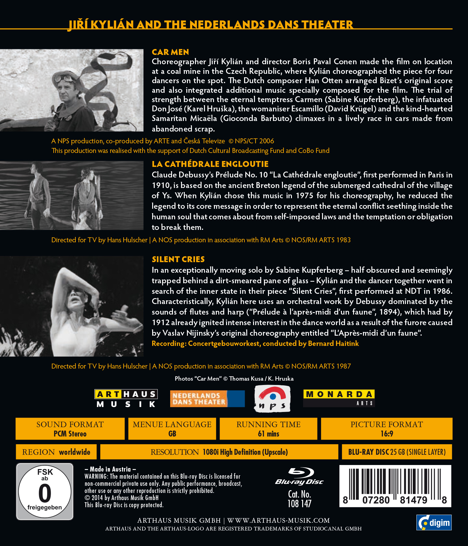 Exactly 20 years separate Jiří Kylián’s solo Silent Cries and his black-and-white film, Car Men, made in 2006 in collaboration with the Dutch filmmaker, Boris Paval Cone. What unites the two works is the sheer expressiveness of the dance on the one hand, and the distinctive facial gestures and body language of the dancer Sabine Kupferberg on the other. Kupferberg is the one who pulls the strings in Car Men, victim and plotter in equal measure, prepared at all times to stand up to life’s problems – as well as to her three co-actors Escamillo, Don José and Micaëla – with humour and enigmatic wit. And so at the end of Kylián’s unusual, slapstick-like tragicomedy, she simply abandons her three colleagues, self-assured and incorrigible – just like her role model Carmen. Including additional ballets by Jiří Kylián: Silent Cries La Cathédrale Engloutie Genau 20 Jahre liegen zwischen Jiří Kyliáns Solo Silent Cries und seinem 2006 gemeinsam mit dem holländischen Filmemacher Boris Paval Conen gedrehten Schwarz-Weiß-Streifen Car Men. Was beide Werke verbindet, ist einerseits die rein tänzerische Ausdruckskraft und andererseits das markante Mienen- bzw. Körperspiel der Interpretin Sabine Kupferberg. Sie ist die Strippenzieherin bei Car Men – Opfer und Intrigantin zu gleichen Teilen, immer bereit, dem Ernst des Lebens ebenso wie ihren drei Mitakteuren Escamillo, Don José und Micaëla mit Humor und hintergründigem Witz zu begegnen. Und so fährt sie in Kyliáns ungewöhnlicher, slapstickartiger Tragikomödie ihren drei Kollegen zu guter Letzt einfach davon, selbstgewiss und unbelehrbar– wie ihr Vorbild: Carmen.