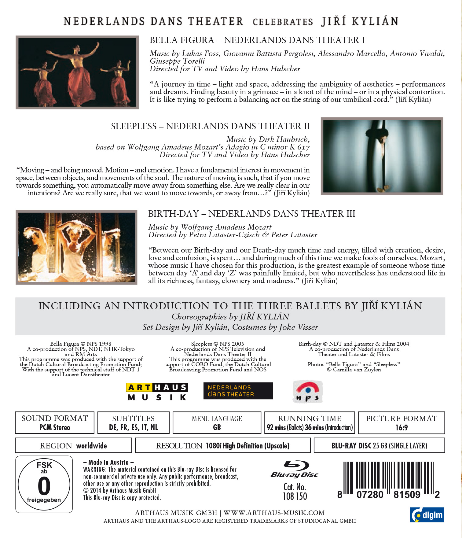 SLEEPLES (Music by Dirk Haubrich): Jirí Kylián has made many masterpieces, one of them the fascinating „Sleepless“, a creation for six young dancers in which the set plays an important part. It has a wall behind which dancers – or sometimes just parts of their bodies – appear, disappear and return. The set allows unexpected entrances or creates hallucinating images of heads which in a grotesque way do not appear to go with the bodies. Birth-Day: Kyliáns Sinn für Humor tritt markant in den Vordergrund, doch hinter dem Humor lauert schon die Tragödie. Schließlich bedeutet jeder Geburtstag einen weiteren Schritt weg vom Tag der Geburt und einen Schritt hin zum Tod. „Schon seit ich sehr jung war, hatte ich das starke Gefühl, dass unsere Geburtsurkunde in Wahrheit unser Todesurteil ist“, sagt Jiří Kylián. „Birth-Day“ spielt mit der Zeit ein Spiel. Mozarts Musik ist entweder Adagio oder Prestissimo und dasselbe gilt für die Bewegungen, die manchmal mit doppelter Geschwindigkeit durchgeführt werden und manches Mal bis zur Bewegungslosigkeit zusammensacken. „Mozart, dessen Musik ich für dieses Projekt gewählt habe, ist ein großartiges Beispiel für jemanden, dessen Zeit zwischen Tag ‚A’ und Tag ‚Z’ zwar nur allzu begrenzt war, aber der das Leben dennoch in all seinem Reichtum, seiner Fantasie, seiner Clownerei und seiner Verrücktheit verstanden hat.“ Bella Figura: Dieses Ballett von Jiří Kylián, bei dem die Tänzer in rote Röcke gehüllt sind – ein Anblick, den die Zuschauer sobald nicht vergessen werden – ist von unbeschreiblicher Schönheit. In „Bella Figura“ wagt sich Jiří Kylián in die Grauzone der menschlichen Seele vor. Traum und Wirklichkeit prallen auf der Bühne aufeinander und verschieben ständig die Perspektive. Blitzartige Bilder ändern sich rapide in Farbe und Stimmung und fließen harmonisch mit einer Collage aus Renaissance- und Barockmusik von Vivaldi, Torelli und Pergolesi zusammen. Das Ergebnis ist unglaublich und rätselhaft zugleich – mit Kyliáns Worten: „Ganz einfach das Gefühl, das man hat, wenn man träumt, man fällt – um dann mit einer gebrochenen Rippe aufzuwachen.“ Sleepless: Jiří Kylián hat viele Meisterwerke geschaffen, eines ist das faszinierende „Sleepless“ – ein Werk für sechs junge Tänzer, in dem das Bühnenbild eine wichtige Rolle spielt. Es verfügt über eine Wand, hinter der die Tänzer – oder manchmal nur ihre Körperteile – auftauchen, verschwinden und wiederkehren. Das Bühnenbild erlaubt unerwartete Auftritte oder schafft optische Täuschungen von Köpfen, die auf groteske Art und Weise nicht auf den Köpfen zu sitzen scheinen.