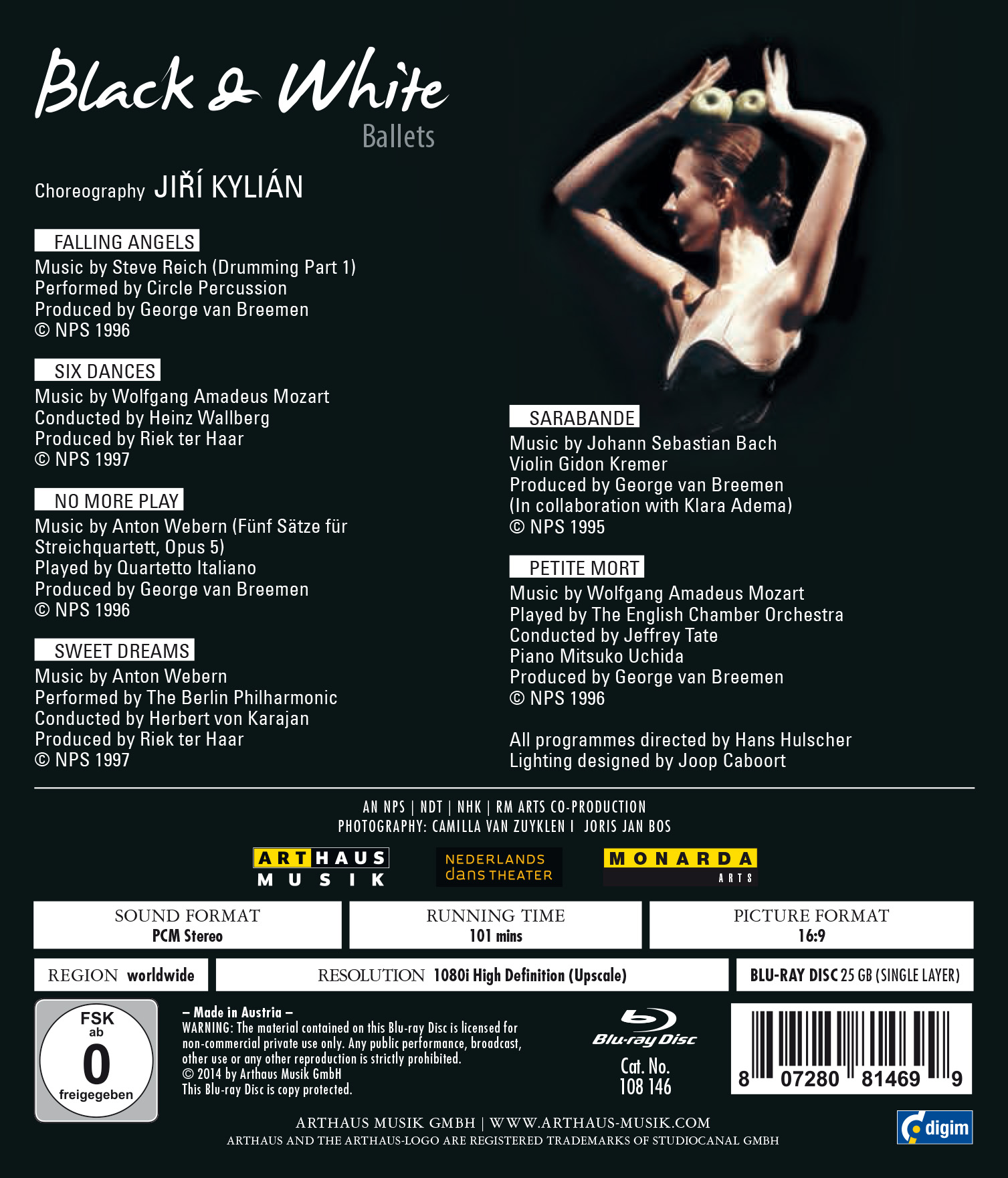 Die sechs abstrakten, ja geradezu surrealistischen Teile der Ballettfolge "Black and White" bieten eine Ahnung von dem Einfallsreichtum der Kylián’schen Choreographien. Sie umfassen nicht nur ein bemerkenswertes Spektrum von Stilen und Stimmungen – von Metaphysik über Schwarzen Humor bis hin zu einer sinnlichen, fast wollüstigen Körperlichkeit – sondern betonen ausdrücklich, dass der Meister des neoklassischen Tanzes auch die Techniken des zeitgenössischen Modern Dance als eine Projektionsfläche für die existentiellen Fragen der Menschheit nutzt. Die Auswahl dieser sechs Programme, die trotz ihrer deutlichen Unterschiede eine nahtlose Einheit bilden, zeigt, was Kylián mit nur 20 Tänzern und einer intelligenten Musikauswahl auf die Bühne stellen kann. Seine ungewöhnliche Technik verbindet das klassische Ballett mit einer urplötzlichen und impulsiven Energie.