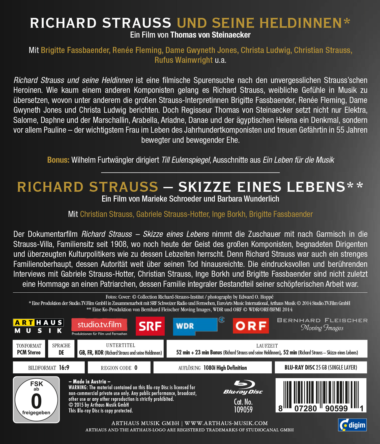 “Richard Strauss and his Heroines” is the first filmed documentation about the unforgettable heroines created by Strauss and how they affected his life and his marriage. Sie heißen Elektra, Salome und Daphne, Arabella, Ariadne und Danae – die unvergesslichen, von Richard Strauss geschaffenen Heroinen. Denn wie kaum einem anderen Komponisten gelang es Strauss, weibliche Gefühle in Musik zu übersetzen. Davon können die großen Strauss-Interpretinnen Brigitte Fassbaender, Renée Fleming, Dame Gwyneth Jones und Christa Ludwig nicht nur ein Lied singen, sondern auch bewegend und eindrucksvoll erzählen. Und das tun sie in Thomas von Steinaeckers preisgekrönter Dokumentation Richard Strauss und seine Heldinnen, die Arthaus Musik nun auch auf Blu-ray Disc veröffentlicht. Nicht zuletzt setzt der Film Pauline eine Denkmal – Richard Strauss’ größter Heldin, Muse und treuer Gefährtin in 55 Jahren bewegter und bewegender Ehe.