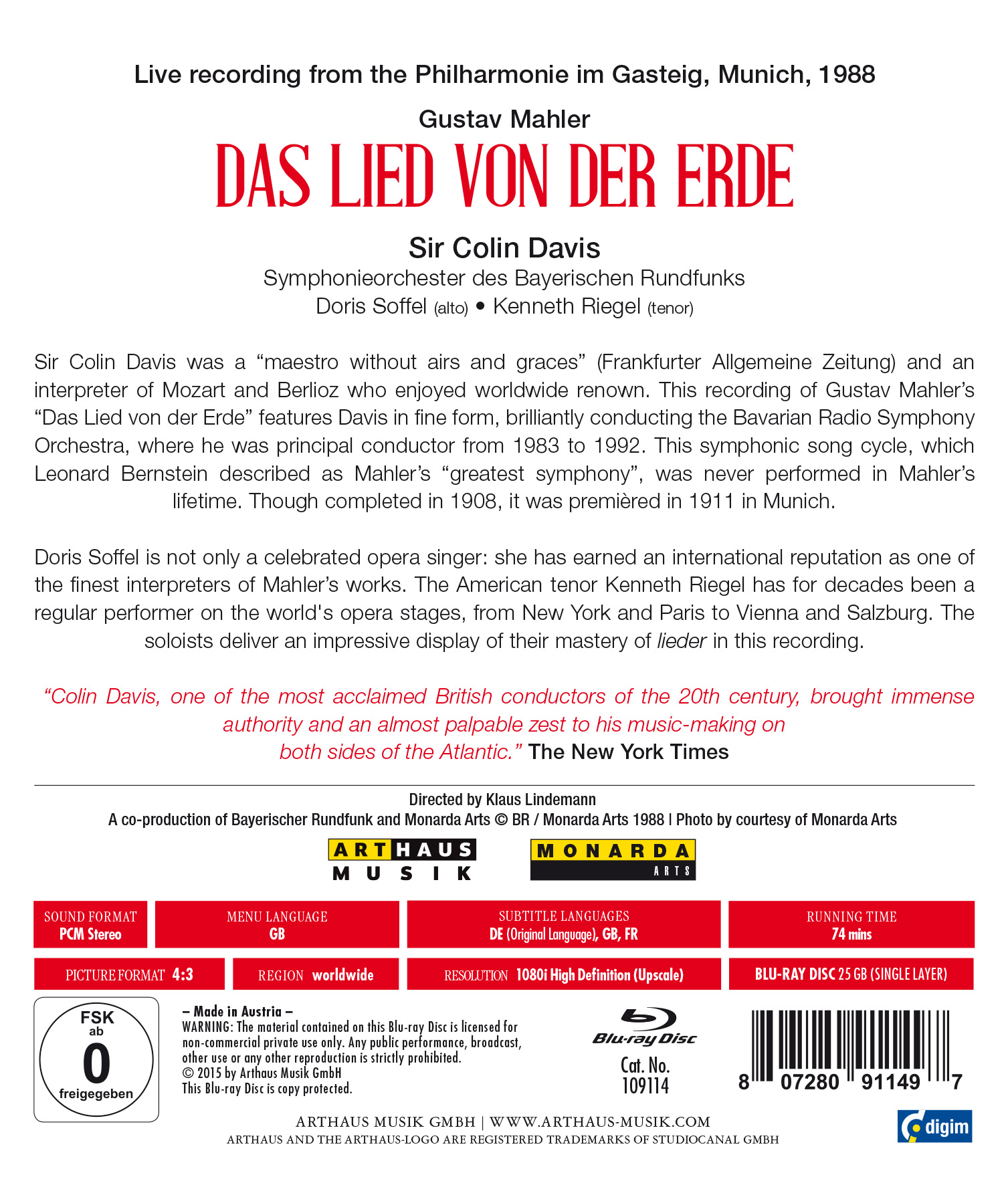 Sir Colin Davis was a “maestro without airs and graces” (Frankfurter Allgemeine Zeitung) and an interpretor of Mozart and Berlioz who enjoyed worldwide renown. This recording of Gustav Mahler's “Das Lied von der Erde” features Davis in fine form, brilliantly conducting the Bavarian Radio Symphony Orchestra, where he was principal conductor from 1983 to 1993. This symphonic song cycle, which Leonard Bernstein described as Mahler's “greatest symphony”, was never performed in Mahler's lifetime. Though completed in 1908, it was first premièred in 1911 in Munich.