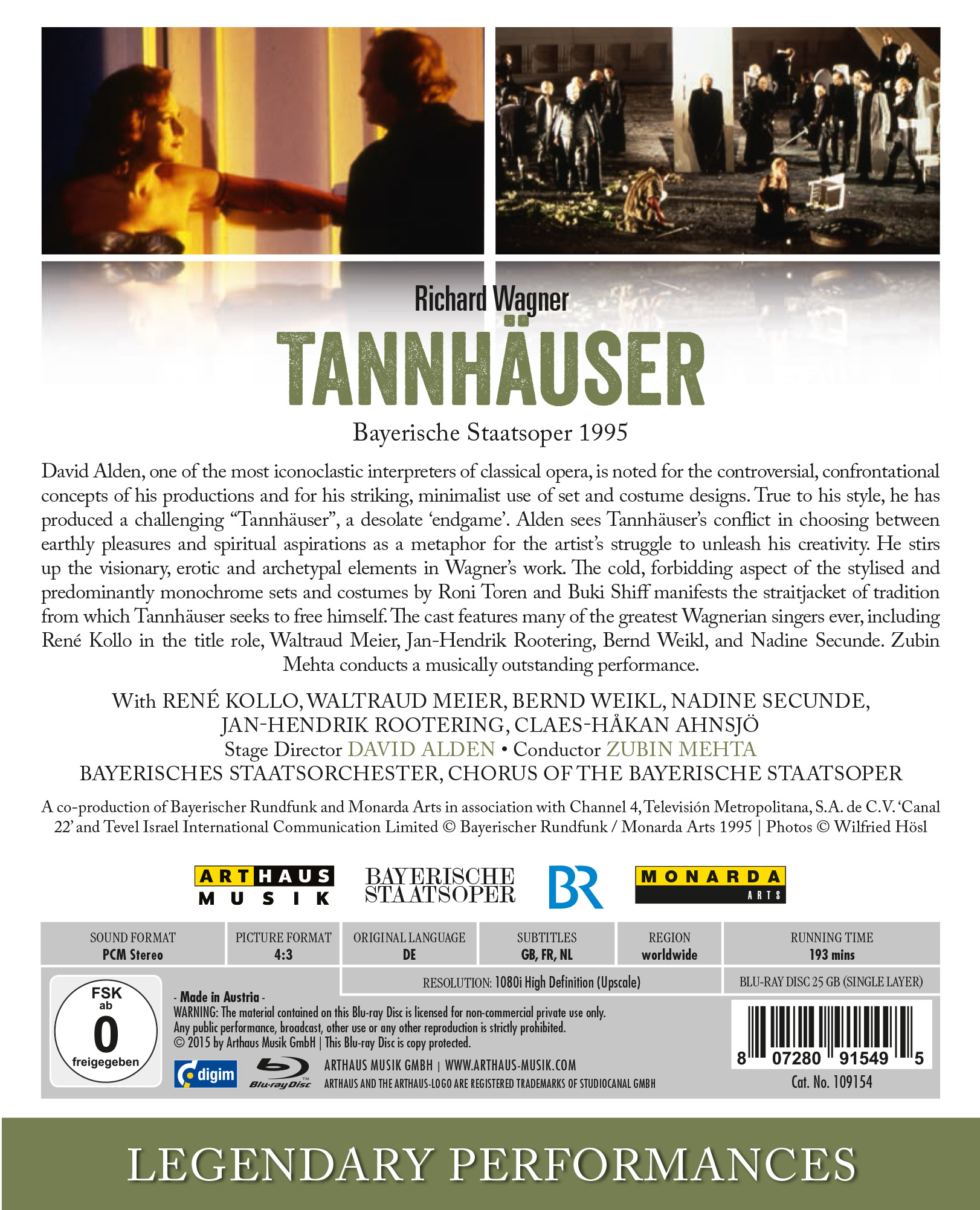 David Alden's new production by the Bavarian State Opera at the National Theater in Munich, which premiered at the opera festival on 6 July 1994, was celebrated by audiences and music journals alike as a milestone of contemporary Wagner adoptions. Zubin Mehta conducted this focused yet enchanting musical interpretation. Der doppelte Titel der am 19. Oktober 1845 unter Wagners Leitung im Dresdner Hoftheater uraufgeführten Oper "Tannhäuser oder der Sängerkrieg auf der Wartburg" bringt bereits zum Ausdruck, wie Wagners Dichtung zwei Stoffkreise verbindet, deren Überlieferung getrennt erfolgte. Die Figur des Minnesängers ist historisch verbürgt und seine Episoden sind mit dem "Tannhäuserlied" seit 1520 belegt. Musikalisch ist der Gegensatz von Diatonik und Chromatik Symbol für verschiedene Welten. Wagner revidierte das ursprünglich 1845 vollendete Werk 1847 unter anderem mit einem geänderten Schluß und bearbeitete die Oper nochmals für eine Pariser Inzenierung 1861 (die hier vorliegende "Pariser Fassung" mit Erweiterungen).