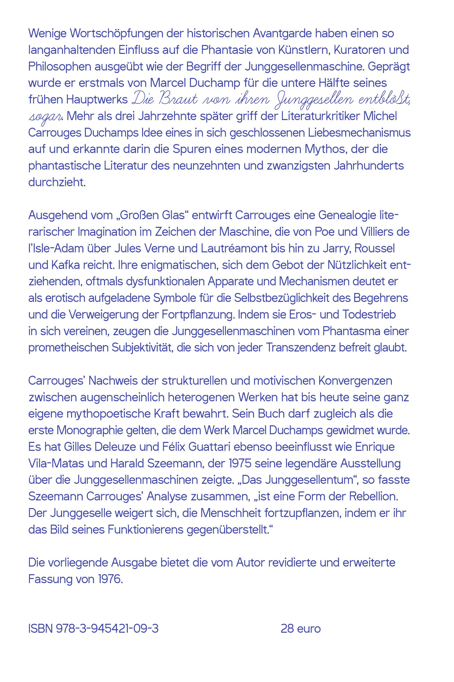 Wenige Wortschöpfungen der historischen Avantgarde haben einen so langanhaltenden Einfluss auf die Phantasie von Künstlern, Kuratoren und Philosophen ausgeübt wie der Begriff der Junggesellenmaschine. Geprägt wurde er erstmals von Marcel Duchamp für die untere Hälfte seines frühen Hauptwerks Die Braut von ihren Junggesellen entblößt, sogar. Mehr als drei Jahrzehnte später griff der Literaturkritiker Michel Carrouges Duchamps Idee eines in sich geschlossenen Liebesmechanismus auf und erkannte darin die Spuren eines modernen Mythos, der die phantastische Literatur des neunzehnten und zwanzigsten Jahrhunderts durchzieht.