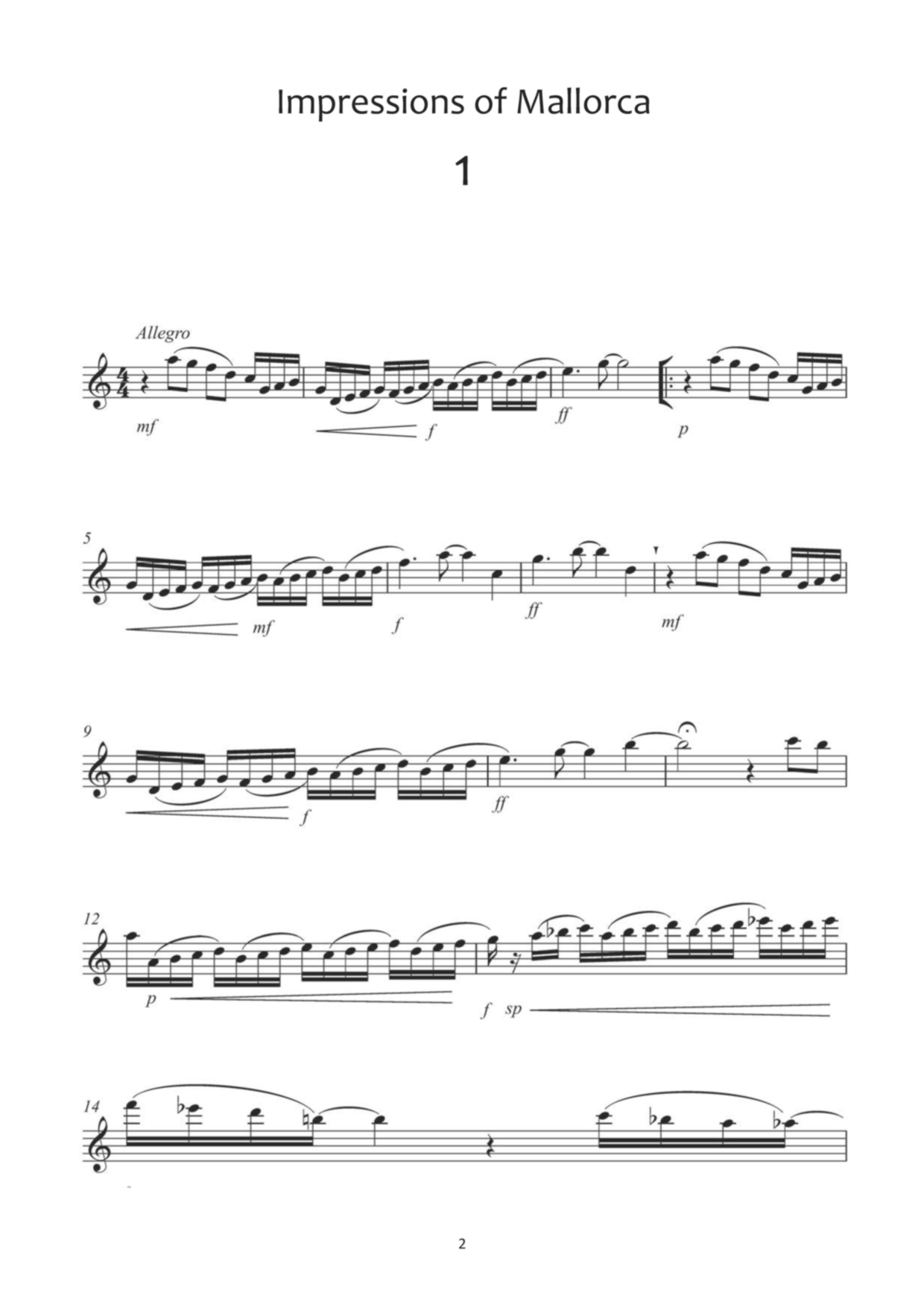 Die Komposition „Impressions of Mallorca“ beschreibt in fünf Bildern (Sätzen) die zauberhafte Naturlandschaft Mallorcas. Die Reise beginnt im Südwesten der Insel und führt den Hörer in einem virtuosen ersten Satz durch das wilde Tramuntana Gebirge; in einem Bogen setzt sie sich fort und zwar über den Norden hinweg - vorbei an den herrlichen Buchten von „Cala St. Vincent“ (2.Satz) - zu dem westwärts gelegenen, gemütlichen und sehenswerten Städtchen „Polenca“ und zu einem der größten Strände Mallorcas, zur „Calla Murada“ (3.Satz). Über den malerischen Hafen von Cala Figueras (4.Satz) gelangt man dann, vorbei an der beeindruckenden Kathedrale von Palma de Mallorca (5.Satz), in die pulsierende Hauptstadt.