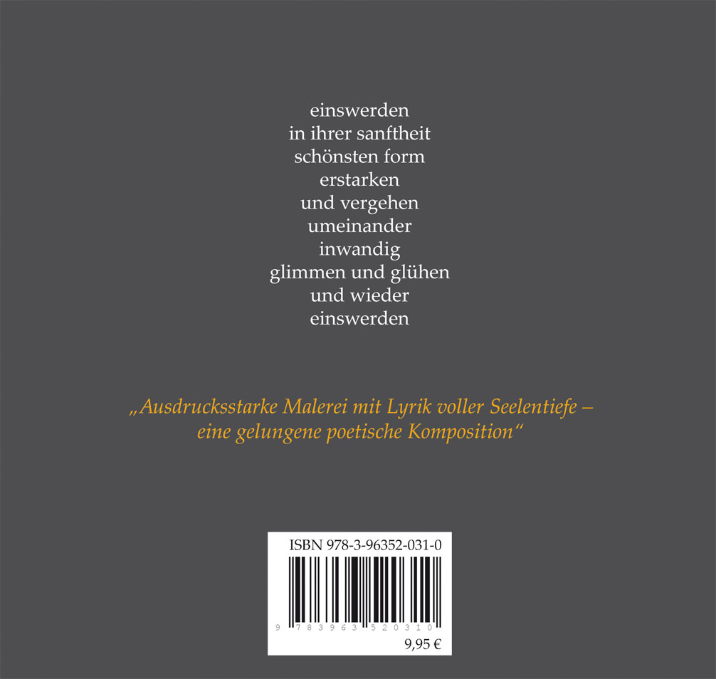 einswerdenin ihrer sanftheitschönsten formerstarkenund vergehenumeinanderinwandigglimmen und glühenund wiedereinswerden"Ausdrucksstarke Malerei mit Lyrik voller Seelentiefe - eine gelungene poetische Komposition"