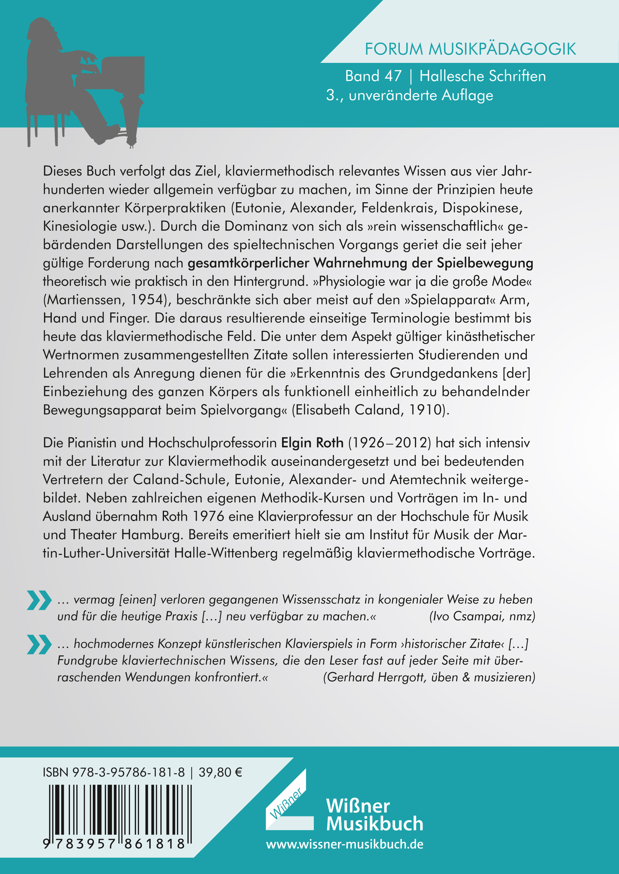 Die Pianistin und Hochschulprofessorin Elgin Roth (1926–2012) hat sich intensiv mit der Literatur zur Klaviermethodik auseinandergesetzt und bei bedeutenden Vertretern der Caland-Schule, Eutonie, Alexander- und Atemtechnik weitergebildet. Neben zahlreichen eigenen Methodik-Kursen und Vorträgen im In- und Ausland übernahm Roth 1976 eine Klavierprofessur an der Hochschule für Musik und Theater Hamburg. Bereits emeritiert hielt sie am Institut für Musik der Martin-Luther-Universität Halle-Wittenberg regelmäßig klaviermethodische Vorträge.