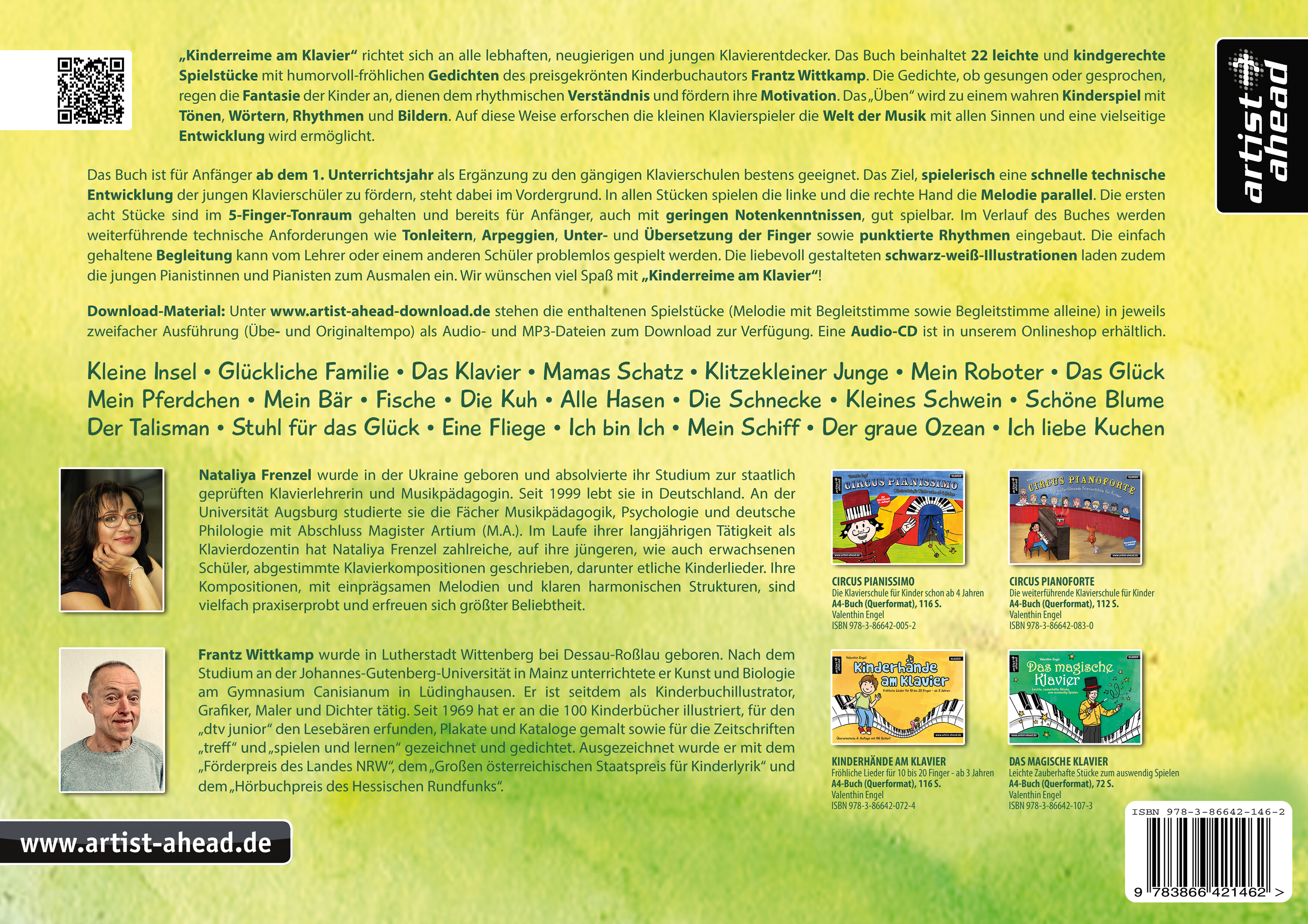 Kinderreime am Klavier richtet sich an alle lebhaften, neugierigen und jungen Klavierentdecker. Das Buch beinhaltet 22 leichte und kindgerechte Spielstücke mit humorvoll-fröhlichen Gedichten des preisgekrönten Kinderbuchautors Frantz Wittkamp. Die Gedichte, ob gesungen oder gesprochen, regen die Fantasie der Kinder an, dienen dem rhythmischen Verständnis und fördern ihre Motivation. Das "Üben" wird zu einem wahren Kinderspiel mit Tönen, Wörtern, Rhythmen und Bildern. Auf diese Weise erforschen die kleinen Klavierspieler die Welt der Musik mit allen Sinnen und eine vielseitige Entwicklung wird ermöglicht.