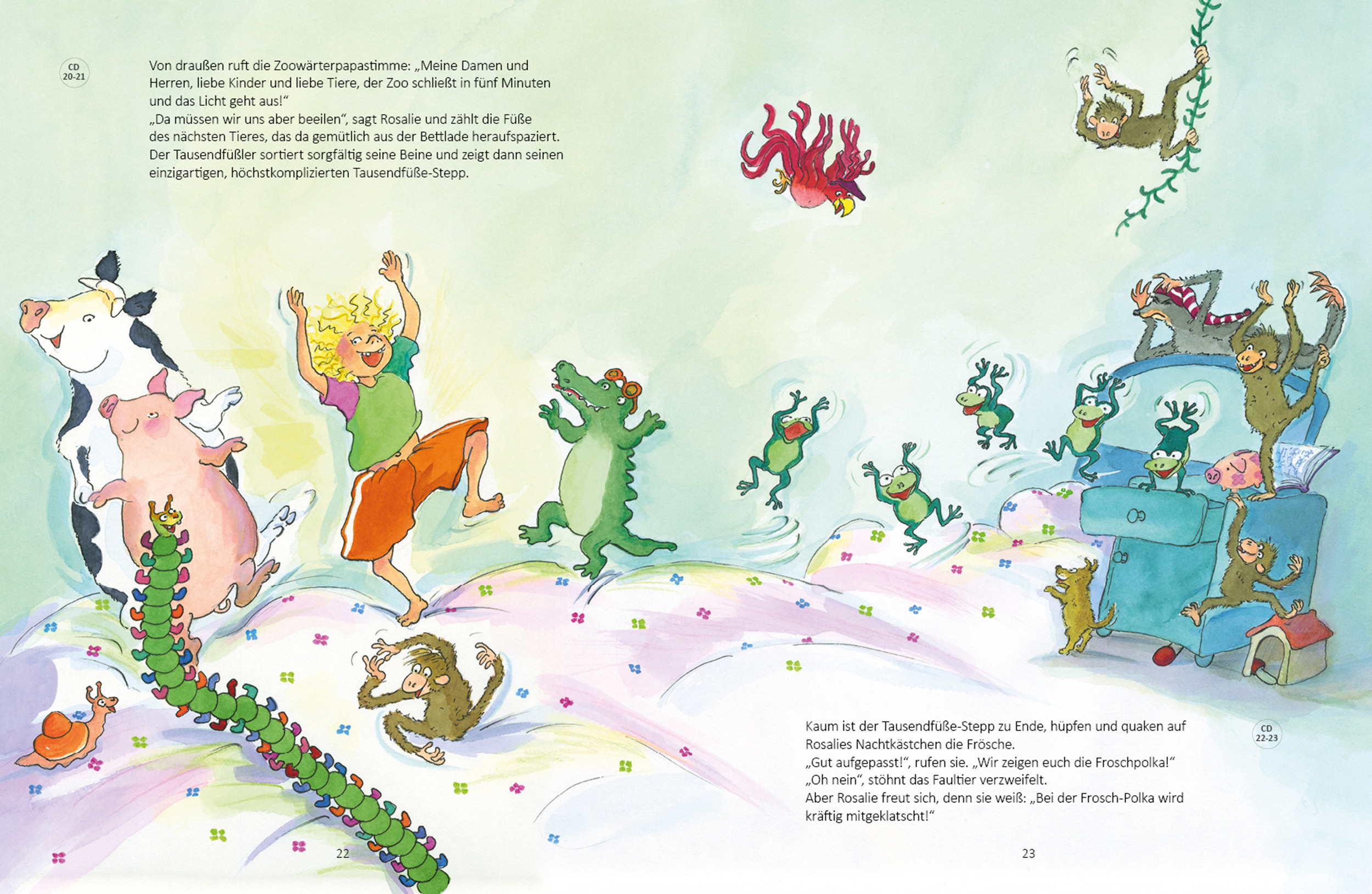 Zeit zum Schlafengehen! Aber Rosalie ist noch gaaar nicht müde ... Auch der Seefahrer-Papagei, das Faultier, die Affen und alle anderen Stofftiere sind noch putzmunter. Da wird aus Rosalies Bett ein musikalischer Zoo, den der Elefant mit lautem Trompetenzauber eröffnet. Alle singen, tanzen, watscheln, wiehern und kuscheln, bis der Zoowärter- Papa-Bär die Ruhezeit einläutet. Und mit einem Lächeln auf den Lippen träumt Rosalie von ihren quietschfidelen Zoofreunden weiter ... Format: 230 x 300 mm - 32 Seiten - gebunden - durchgehend farbig illustriert Die gleichnamige CD ist im JUMBO Verlag erschienen.