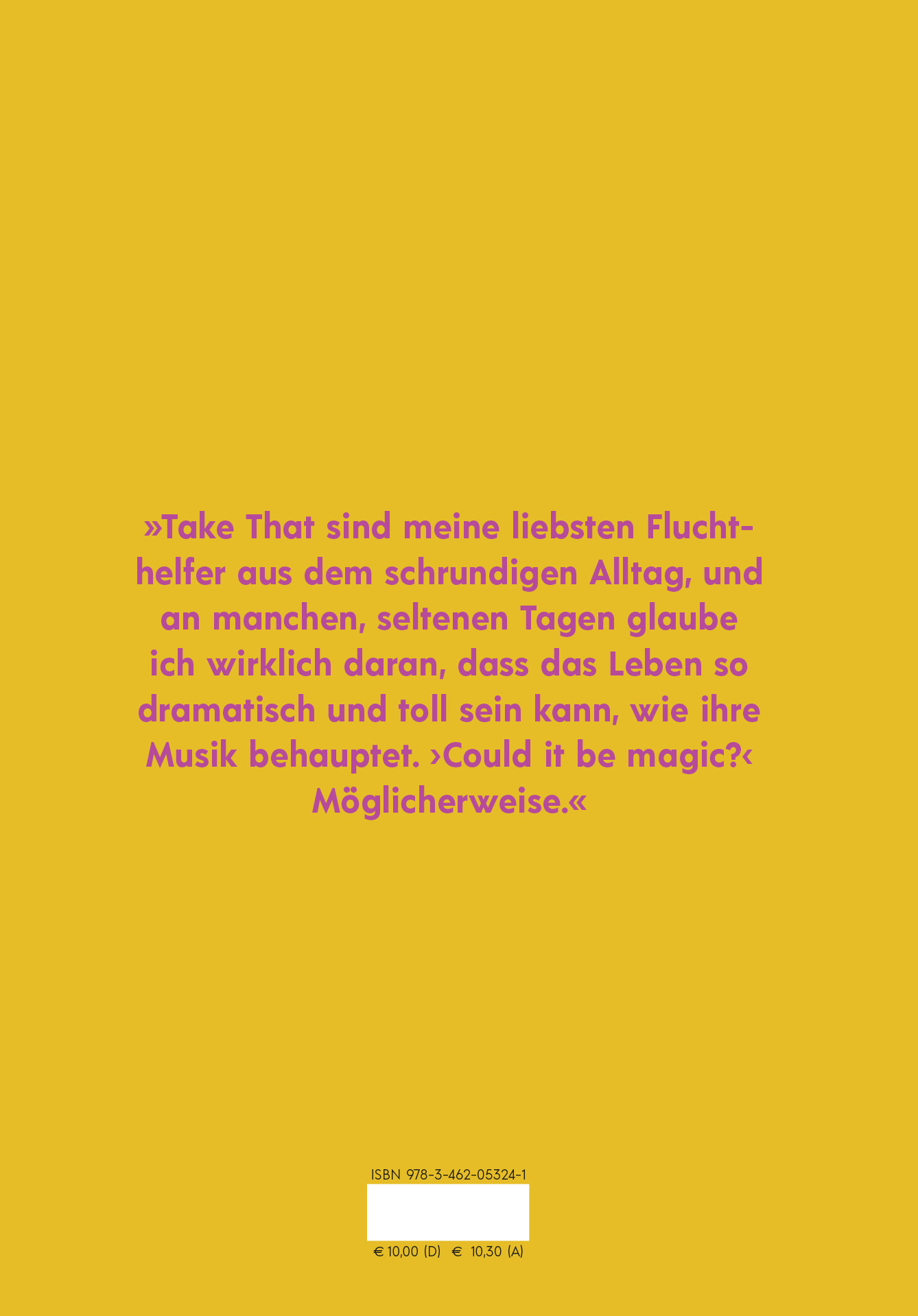 1996 musste Anja Rützel zwei Mal bitterlich weinen: um ihr eingestelltes Lieblingsmagazin Tempo - und um ihre aufgelöste Lieblingsband Take That. Aus ihren Liedern hatte sie alles gelernt, was man über das Suchen und Erfinden der Liebe wissen muss. Aus der Trennung und der glücklichen Wiedervereinigung lernte sie dann alles über Hass und Versöhnung. Und über würdevoll cooles Erwachsenwerden im Pop und anderswo.