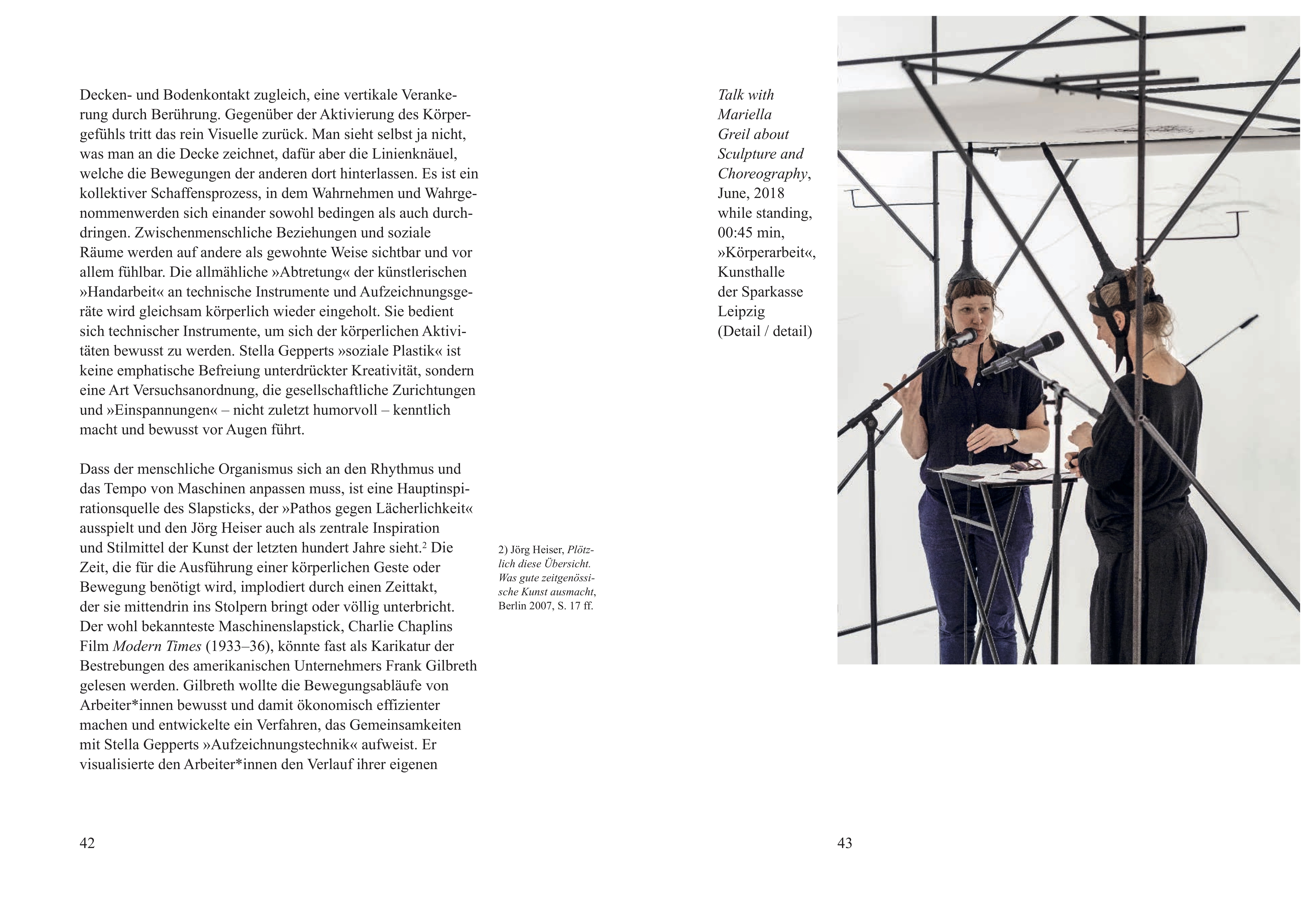 "Für mich haben Gespräche architektonische Formen ..." Stella Geppert (lebt und arbeitet in Berlin und Halle) ist Bildhauerin und Performancekünstlerin. Bildhauerei ist für sie Verhältnisforschung von Körper, Raum und Bewegung. Dabei liegt ihr Fokus auf der sozialen Interaktion. Sie betrachtet verbale und non-verbale Kommunikation als bildhauerisches Ereignis und entgrenzt in ihrer Arbeit skulpturale Praktiken und performative Strategien. "Bildhauerisches Arbeiten verstehe ich als einen Prozess, der sich aus den im Raum vorherrschenden körperlichen Handlungen und Verhaltensweisen wie auch architektonischen Beziehungen heraus bildet, Bewegungen motiviert und Bilder generiert." Das vorliegende Buch dokumentiert erstmals Stella Gepperts prozessorientierte Raumexperimente, die sie seit 2015 in ihrer Skulptur Hieroglyphendecke realisiert, und präsentiert eine Auswahl von Zeichnungen, die während der unterschiedlichen Performances in der skulpturalen Konstruktion entstanden sind. Mit Texten von Maren Butte und Ludwig Seyfarth.