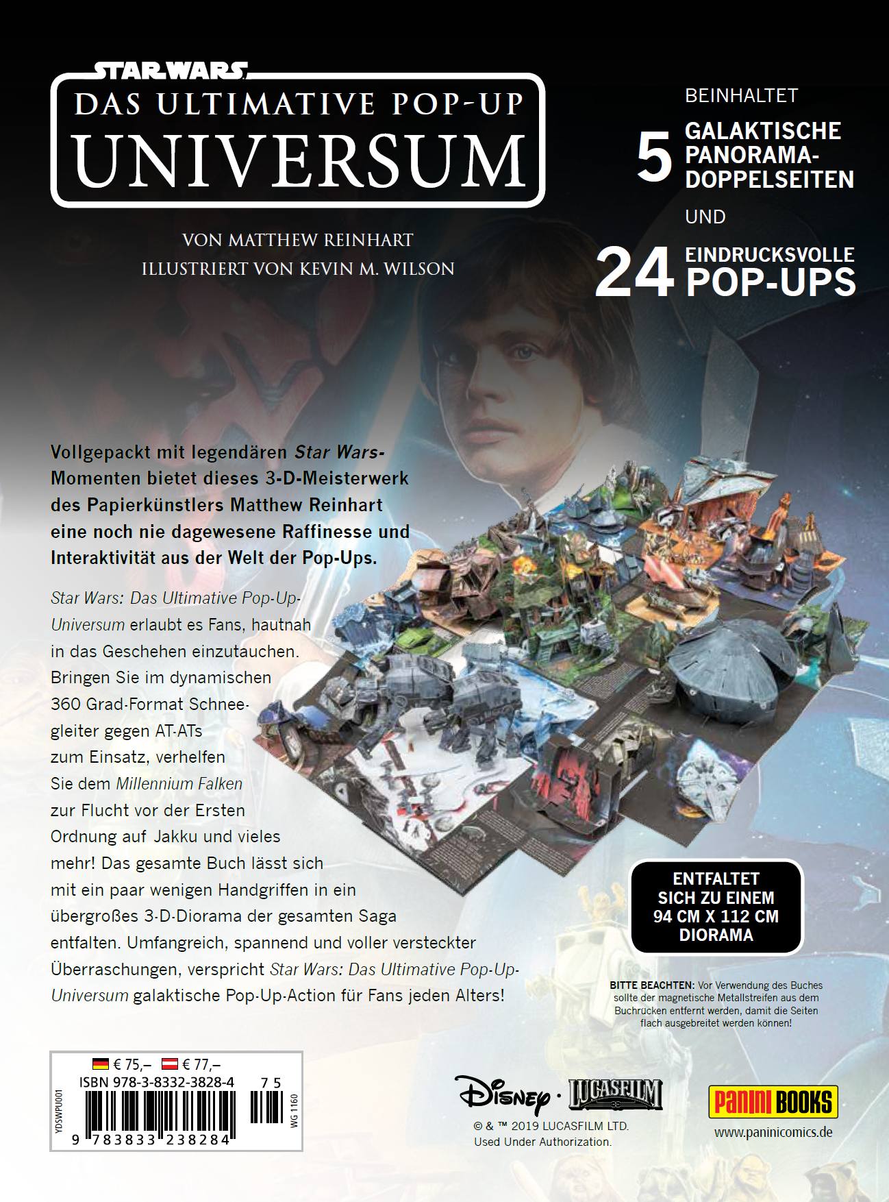 Vollgepackt mit legendären Star Wars-Momenten bietet dieses 3-D-Meisterwerk des Papierkünstlers Matthew Reinhart eine noch nie dagewesene Raffinesse und Interaktivität aus der Welt der Pop-Ups.Star Wars: Das Ultimative Pop-Up-Universum erlaubt es Fans, hautnah in das Geschehen einzutauchen. Bringen Sie im dynamischen 360 Grad-Format Schneegleiter gegen AT-ATs zum Einsatz, verhelfen Sie dem Millennium Falken zur Flucht vor der Ersten Ordnung auf Jakku und vieles mehr! Das gesamte Buch lässt sich mit ein paar wenigen Handgriffen in ein übergroßes 3-D-Diorama der gesamten Saga entfalten. Umfangreich, spannend und voller versteckter Überraschungen, verspricht Star Wars: Das Ultimative Pop-Up-Universum galaktische Pop-Up-Action für Fans jeden Alters!Beinhaltet 5 galaktische Panoramadoppelseiten und 24 eindrucksvolle Pop-upsEntfaltet sich zu einem 94 cm x 112 cm Diorama