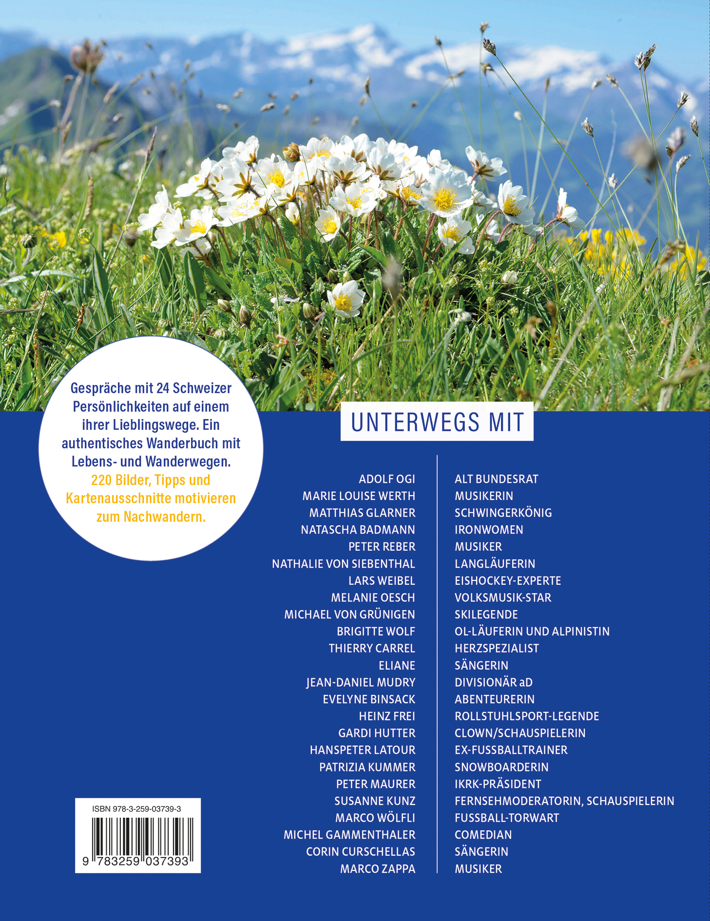 UNTERWEGS mit Persönlichkeiten Wie und wo wandern Weltmeister, Olympiasieger-innen, Musikstars oder Krisenmanager? Mit wie viel Leidenschaft sind sie unterwegs, haben sie Lieblingswege oder Kraftorte? Benötigen sie eine spezielle Einladung, um sich zu für eine Wanderung zu motivieren? Diesen und andern Fragen geht der Autor Beat Straubhaar in seinem neusten, etwas anderen Wanderbuch nach. «UNTERWEGS - Persönlich¬keiten und ihre Wege» enthält Gespräche mit 24 Persönlichkeiten aus Sport, Kultur und Wirtschaft auf einem ihrer Lieblingswege. Ein authentisches Wanderbuch mit Lebens- und Wanderwegen. Das Buch enthält über 200 Bilder der Wanderungen und Tipps zu Sehenswürdigkeiten unterwegs. Kartenausschnitte und Höhenprofile motivieren zum Nachwandern. Dazu gehören praktische Infos zu Dauer und Anforderungen sowie Angaben über ÖV-Verbindungen. Er war unterwegs mit Adolf Ogi, Marie Louise Werth, Matthias Glarner, Natascha Badmann, Peter Reber, Nathalie von Siebenthal, Lars Weibel, Melanie Oesch, Mike von Grünigen, Brigitte Wolf, Thierry Carrel, Eliane, Jean-Daniel Mudry, Evelyne Binsack, Heinz Frei, Gardi Hutter, Hanspeter Latour, Patrizia Kummer, Peter Maurer, Susanne Kunz, Marco Wölfli, Michel Gammenthaler, Corin Curschellas und Marco Zappa.