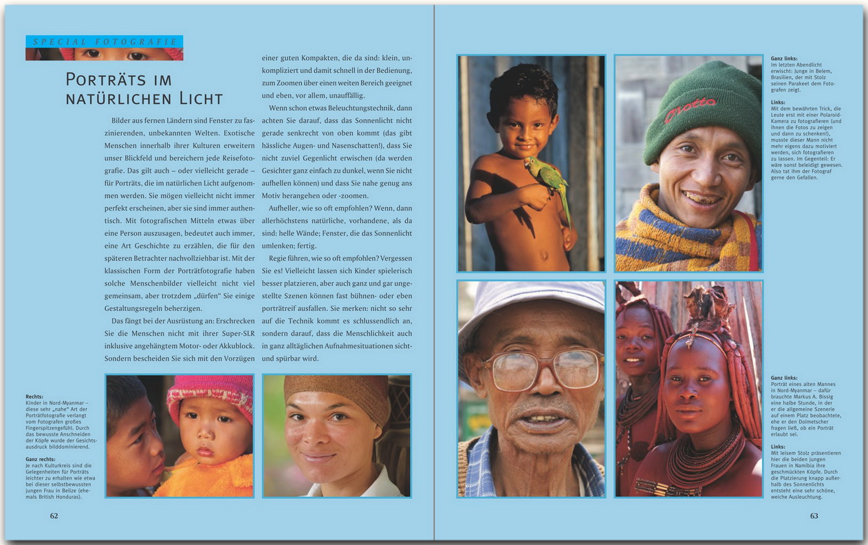 Die Fotografen und Kursleiter Markus Bissig und Christian Heeb zeigen anhand eines opulenten Bilderbogens, wie es gemacht wird. Sie geben Auskunft, wie man die verschiedenen Motiv-Kategorien ins richtige Licht setzt. Der versierte Autor Martin Sigrist ist Chefredakteur der Fotozeitschrift Sony Spiegel und ein erfahrener Didaktik. Anhand fantastischer Fotos wird dem Leser ein Bild von den Anforderungen und Freuden der Reisefotografie vermittelt.